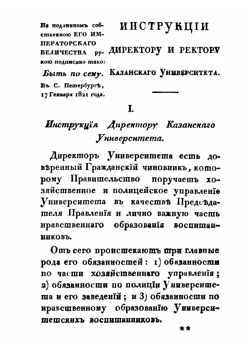 Инструкции директору и ректору Императорскаго Казанскаго университета, утвержденные в С.-Петербурге, 17 января 1820 года.