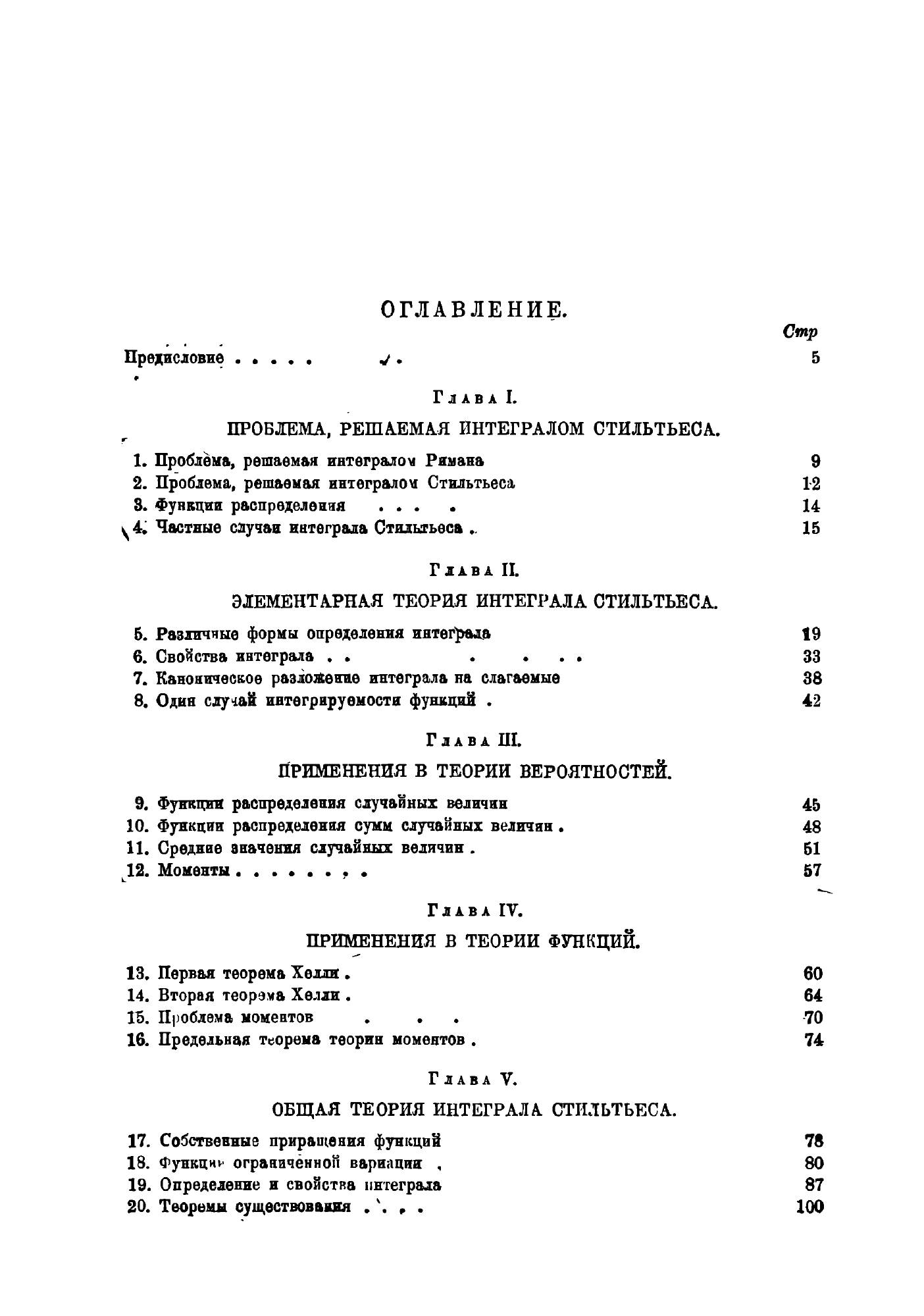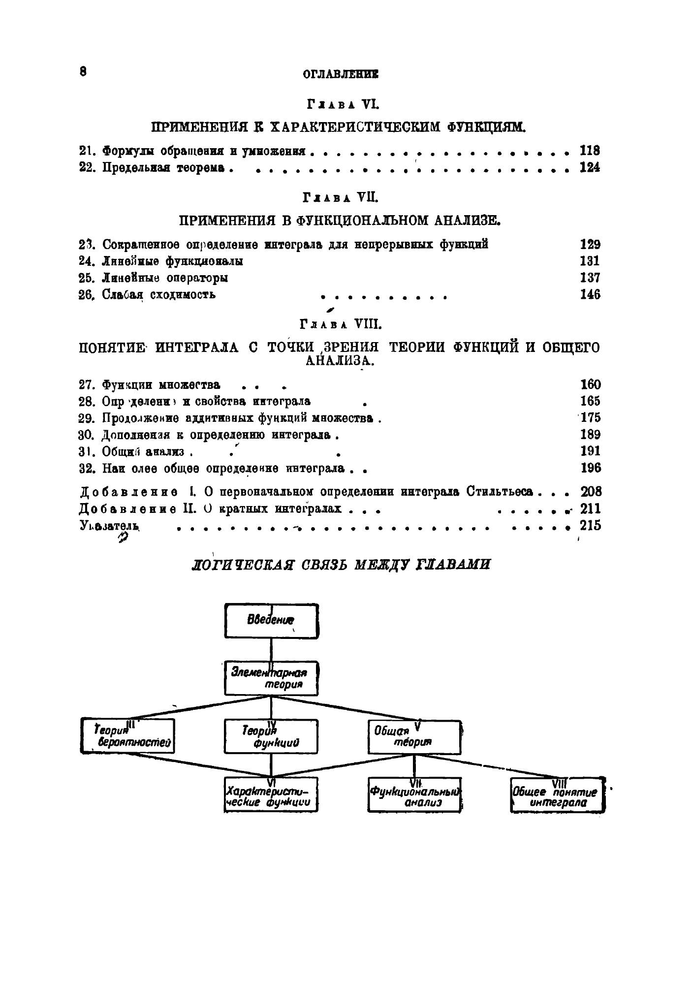 Эта книга предназначаетзя для аспирантов и студентов-математиков старших курсов. Но я стремился сделать ее доступной и полезной также и научным работникам по механике и фязике.Математик найдет в ней прежде всего теорию интегралов типа интеграла Стильтьеса как в их простейшей концепции интегралов функций одного действительного переменного, тхк и в современных обобщениях этой концепции. Не считая возможным загромождать книгу изложением специальных определений интеграла, которые встречаются в современной литературе, как, например, интеграл Хеллингера в теории квадратичных форм или интеграл Риса в теории субгармонических функций, я стремился, напротив, возможно выпуклее выяснить те основные принципы, на которых базируются такого рода определения, и выбрал только интегралы, определенные с наиболее широкой точки зрения.В особое положение я поставил самый интеграл Стильтьеса, уделив ему и его применениям особенно много внимания. Во-первых, потому, что именно детальное изучение самого интеграла Стильтьеса является наилучшим введением к глубокому пониманию общих концепций. Во-вторых, потому, что применения интеграла Стильтьеса в настоящее время уже настолько проникли в некоторые области математики, что достаточно серьезное изучение этих областей без интеграла Стильтьеса немыслимо. Подобным применениям я посвятил отдельные главы; читатель, который не интересуется соответствующими вопросами, может опустить эти главы баз ущерба для понимания всего остального.