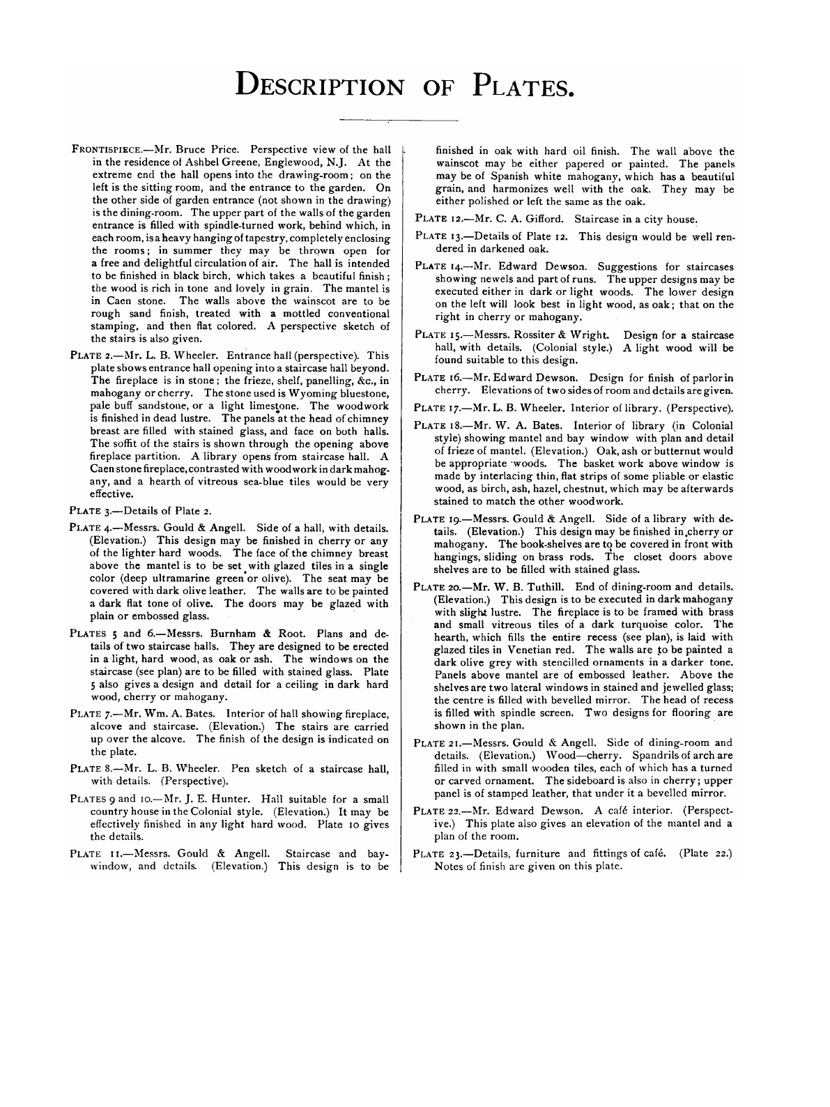 Interiors and Interior Details: Fifty-two Large Quarto Plates, Comprising a Large Number of Original Designs of Halls, Staircases, Parlors, Libraries, Dining Rooms, &c. ... and a Large Collection of Interior Details Suited to the Requirements of Carperters, Builders and Mechanics, Reproduced from the Drawings of Prominent Architects of New York, Boston, Chicago, and Other Cities ; with an Introduction, Description of Plates, and Notes of Wood Finish
