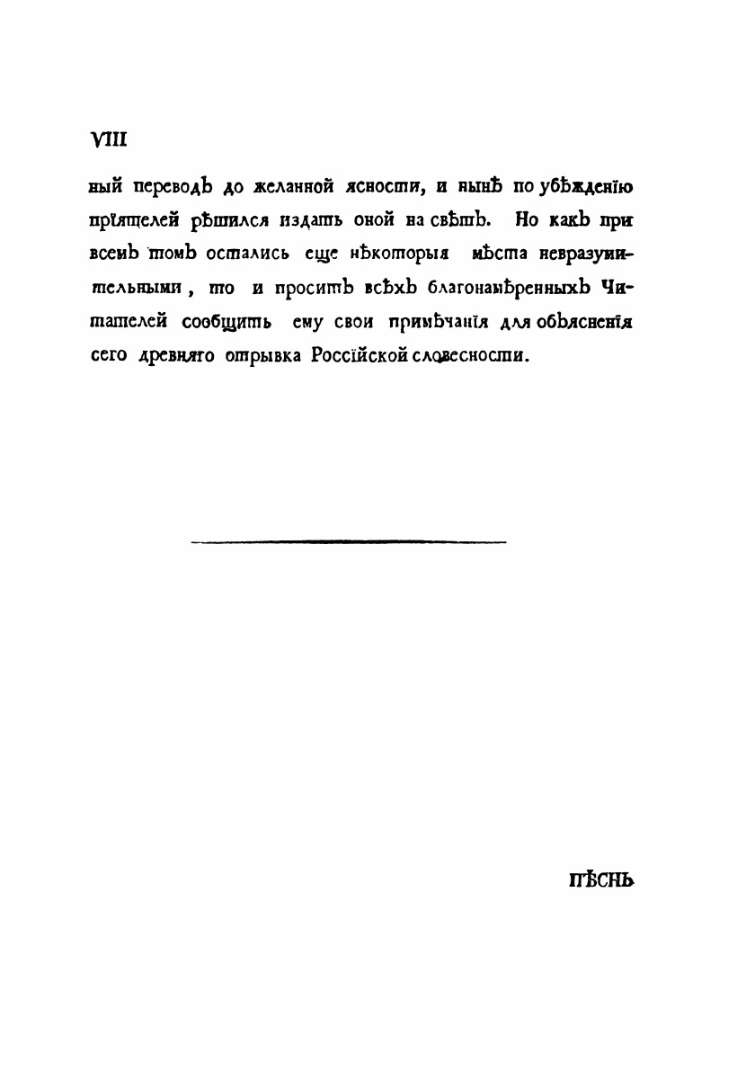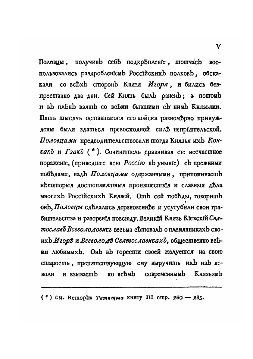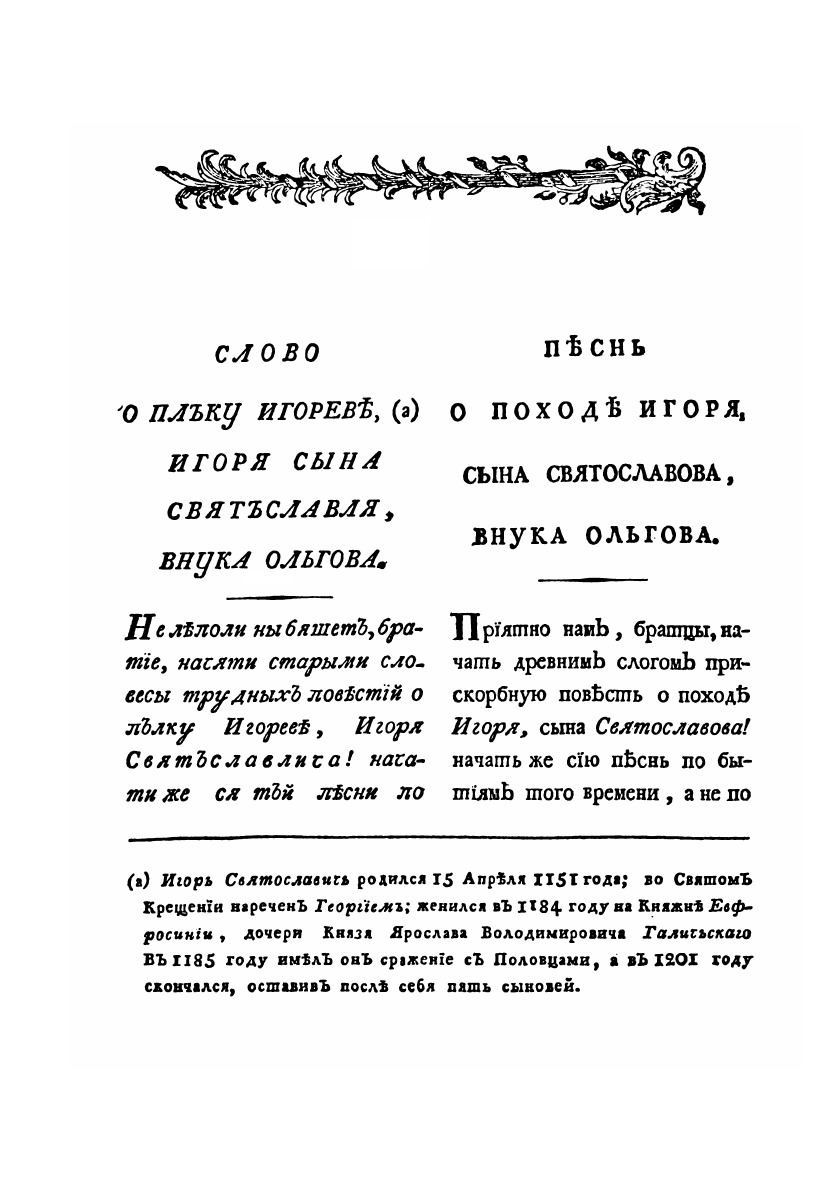 Ироическая песнь о походе на половцов удельного князя Новагорода-Северского Игоря Святославича, писанная старинным русским языком в исходе XII столетия с переложением на употребляемое ныне наречие.