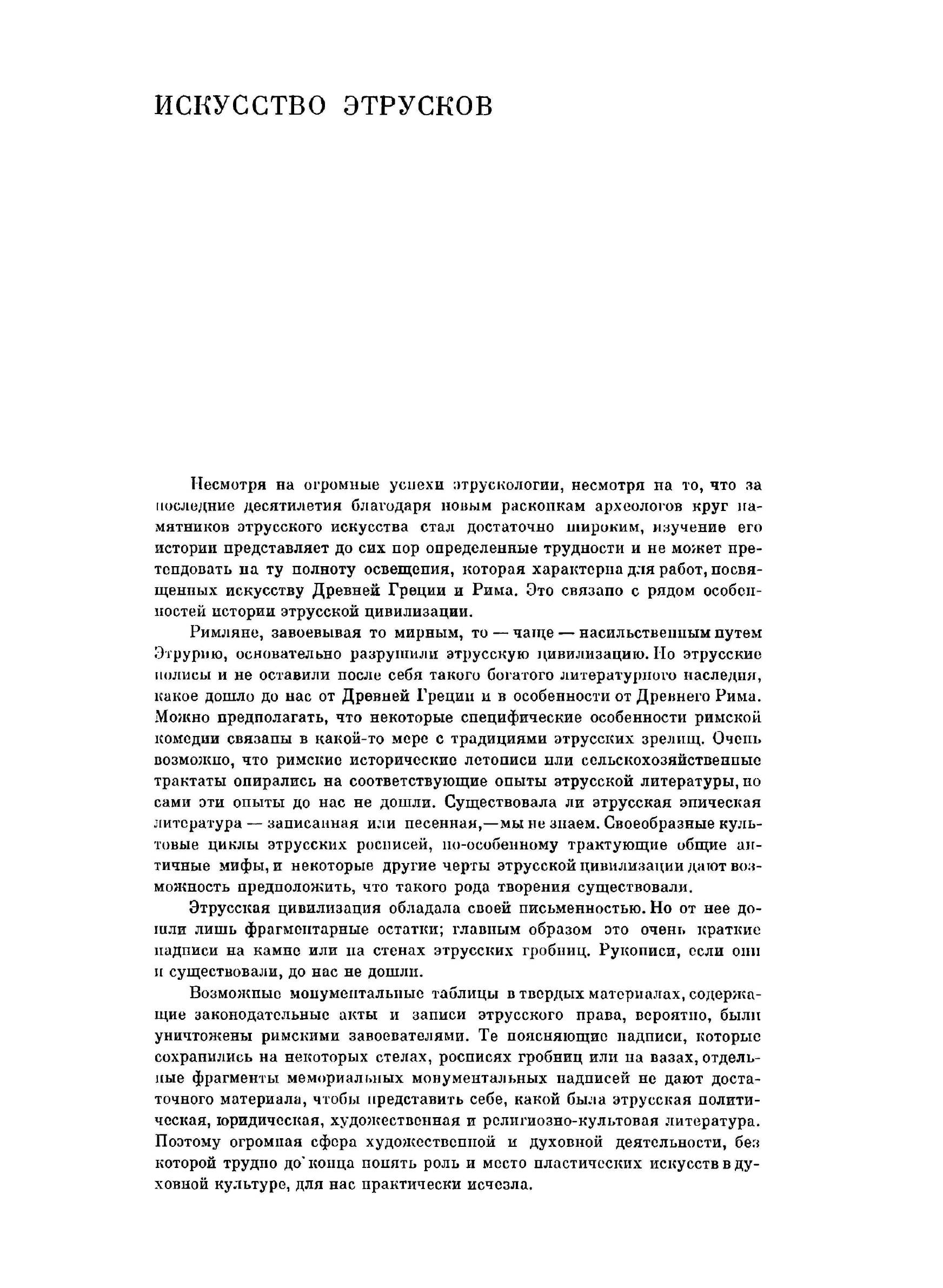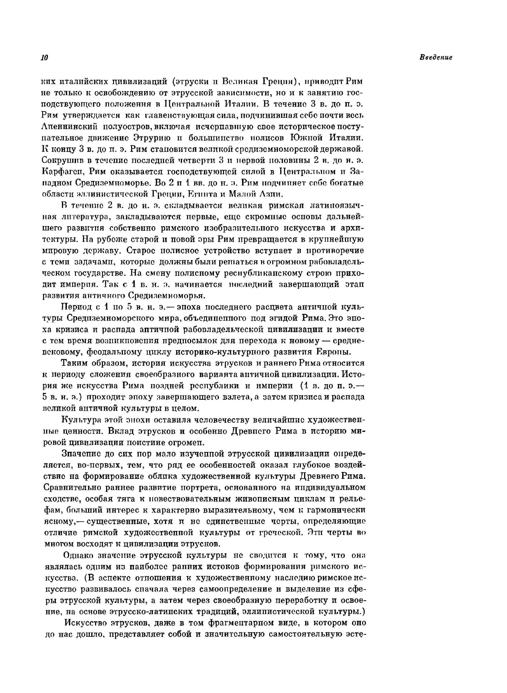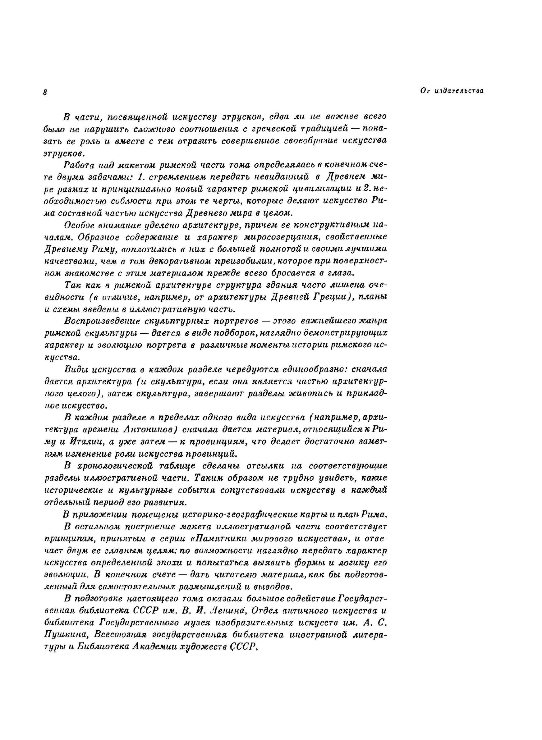 Предлагаемый читателю том посвящен искусству этрусков и Древнего Рима. Он должен рассматриваться как естественное продолжение выпусков, посвященных искусству Древнего Востока и Древней Греции. С его выходом получают важное пополнение тома, охватывающие искусство Древнего мира.Три названных тома позволяют читателю составить общее представление об искусстве Древнего мира как целостной стадии в развитии мирового искусства. Подбор иллюстраций и макет томов даются в возможном соответствии с характером каждого из этапов его эволюции. Так, внеперсональный монументализм искусства Древнего Востока, а затем отмеченное совсем иными идеями и масштабами искусство Древней Греции сменяются мощным имперским размахом и интересом к индивидуальным проявлениям цивилизации Древнего Рима. Читатель имеет возможность проследить развитие мирового искусства от момента выхода его из первобытной стадии и вплоть до появления тенденций, характеризующих наступление эпохи Средних веков.