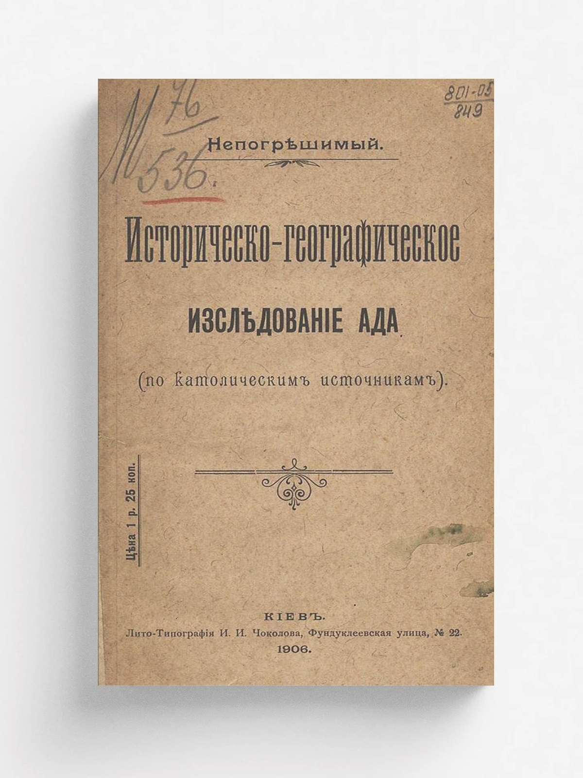 Скроховский, Константин Осипович (–1906). Историческо-географическое исследование ада (по католическим источникам) / Непогрешимый [псевд.]. — Киев: лито-тип. И. И. Чоколова, 1906. — 175 с.; 22.