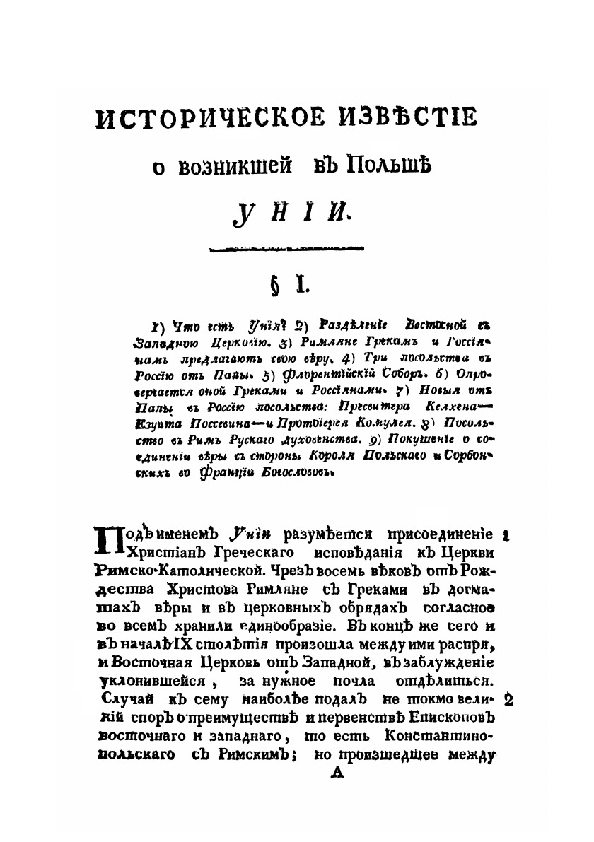 Историческое известие о возникшей в Польше Унии. С показанием начала и важнейших, в продолжение оной чрез два века, приключений. Из хранящихся в Государственной Коллегии Иностранных дел в Московском Архиве актов и разных исторических книг, 1795 года собранное.