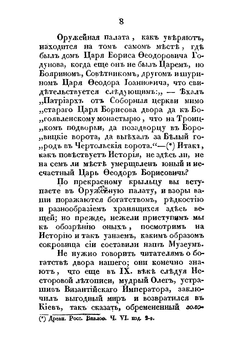 Очерк фондов и сокровищ Оружейной Палаты Московского Кремля по состоянию на 1835 год. Описаны все редкости, которые хранились в этом уникальном музейном собрании русских царей. Рассказано о происхождении вещей, о том, как попали те или иные редкости в сокровищницу. Рассказ о драгоценных уборах, оружии, повозках, конской упряжи, посуде совмещен с повествованием об обычаях и законах русских монархов, о правилах этикета, которые были приняты при дворе Рюриковичей.