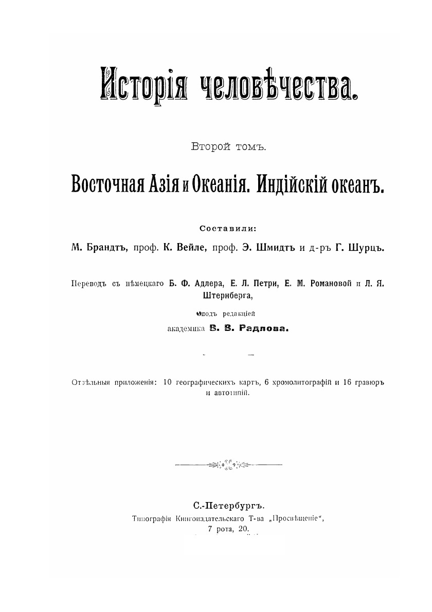 История человечества. Всемирная история в 9-ти томах. Фундаментальный труд известных историков посвящен истории всего человечества на Земле. Это и палеонтологические исследования, история развития различных народов всех частей света, научные достижение, география, самые яркие личности человечества, культура и быт и многое-многое другое. Том 2: Восточная Азия и Океания. Индийский океан. Составили: М. Брандт, проф. К. Вейле, проф. Э. Шмидт и д-р Г. Шурц.Перевод с немецкого Б.Ф. Адлера, Е.Л. Петри, Е.М. Романовой и Л.Я. Штеринберга, под редакцией академика В.В. Радлова. Отдельные приложения: 10 географических карт, 6 хромолитографий и 16 гравюр и автопий, (все изображения в чб).