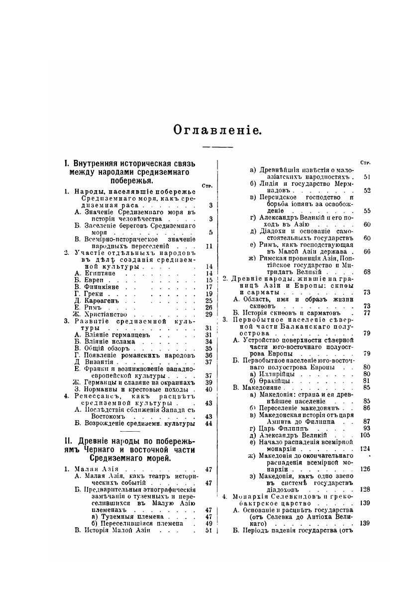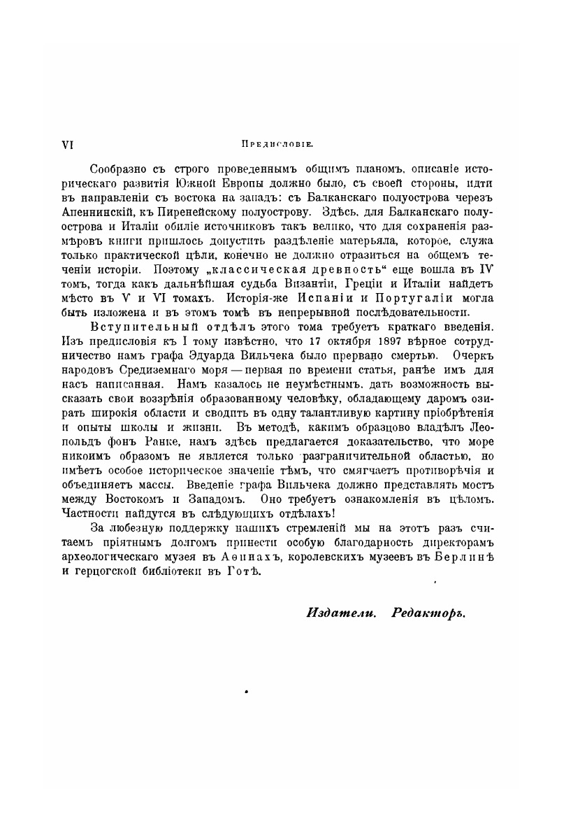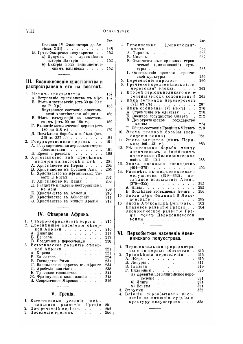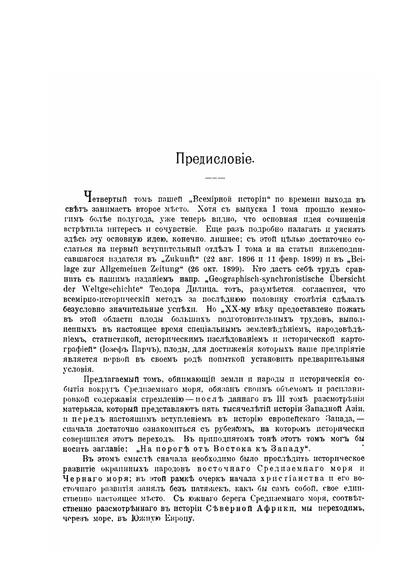 Всемирной истории надлежало дать фундамент, который не только допускал бы, но прямо способствовал построению истории всего человечества на земле. Отсюда и вытекла необходимость воспользоваться итогами палеонтологических исследований, а также развития так называемых дикарей до степени полукультурных народов. Самое тщательное обсуждение и добросовестная проверка всех прочих приемов изложения привели к группировке на основании этногеографических точек зрения, как возбуждающей наименее возражений. Здесь впервые широко признается историческое значение океанов, разделяющих и соединяющих народы. Прослеживается история Восточной Азии и Океании, Западной Азии, Европы, Средиземного моря и стран по побережьям, Африки и т. д.