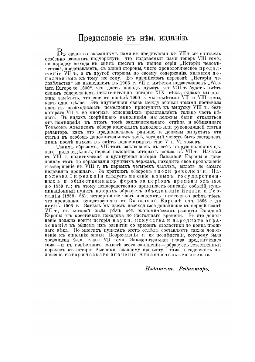 Всемирной истории надлежало дать фундамент, который не только допускал бы, но прямо способствовал построению истории всего человечества на земле. Отсюда и вытекла необходимость воспользоваться итогами палеонтологических исследований, а также развития так называемых дикарей до степени полукультурных народов. Самое тщательное обсуждение и добросовестная проверка всех прочих приемов изложения привели к группировке на основании этногеографических точек зрения, как возбуждающей наименее возражений.Здесь впервые широко признается историческое значение океанов, разделяющих и соединяющих народы. Прослеживается история Восточной Азии и Океании, Западной Азии, Европы, Средиземного моря и стран по побережьям, Африки и т. д.Полный перевод со значительными дополнениями для России, выполненный избранными русскими учеными. Третье издание со стереотипа.Издание не подлежит вывозу за пределы Российской Федерации.