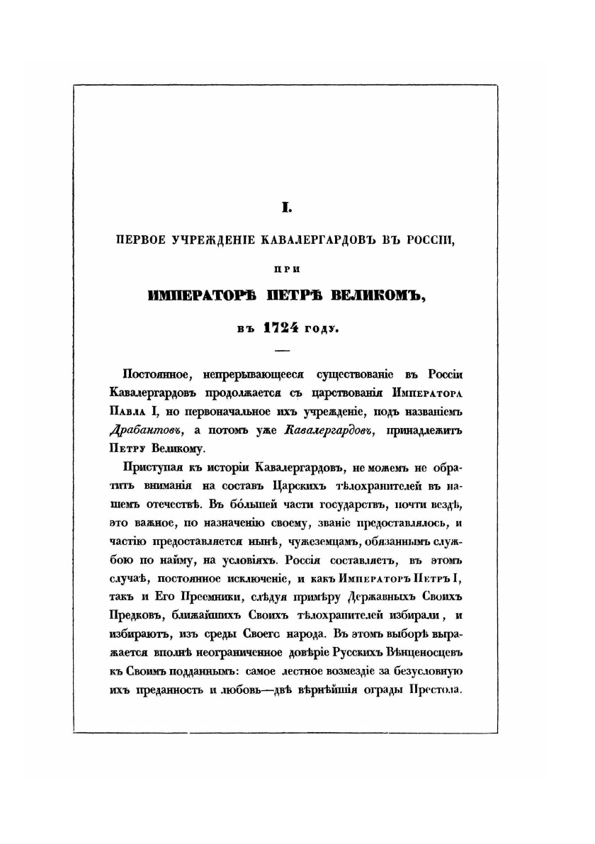 Данное издание представляет собой очерк истории Кавалергардского полка с момента его образования до 1851 г. Ни одна другая часть русской гвардии не имела столь удивительной истории. «Мы не стремимся быть первыми, но никого не допустим быть лучше нас», таким был девиз кавалергардов. Офицеров полка действительно всегда отличала верность рыцарским традициям, природный аристократизм и самопожертвование. Создание самого привилегированного из полков русской армии относится к 1724 г. времени коронации супруги Петра Великого императрицы Екатерины I. В качестве почётной стражи для этой церемонии был сформирован отряд из 50 драбантов или Кавалергардский корпус. В течение XVIII в. это формирование как почётная стража императора, комплектовавшееся исключительно из представителей российской знати, видоизменялось, расформировывалось и образовывалось снова. В 1800 г. император Павел I переформировал Кавалергардский корпус в лейб-гвардии Кавалергардский полк, который и вошел в состав войск гвардии на равных правах с другими гвардейскими полками, без сохранения привилегии комплектования только дворянами. Первым шефом полка был назначен генерал Ф.П. Уваров, а командиром полка с 1803 г. стал генерал-майор Н.И. Депрерадович (погиб в 1813 г.). С начала царствования Николая I шефом полка стала императрица Александра Федоровна, и с 1831 г. полк именовался Кавалергардским Её Величества полком. С 1857 г. Кавалергардский полк являлся первым из шести полков 1-й гвардейской кавалерийской дивизии, в которую кроме четырёх кирасирских (тяжелой кавалерии) входили и два гвардейских казачьих полка.Боевое крещение Кавалергардский полк принял в битве под Аустерлицем (20 ноября 1805 года). В критический момент сражения, кавалергарды атаковали французскую кавалерию, осаждавшую Семёновский полк, однако и сами оказались в окружении. Из двух эскадронов полка вырваться сумели лишь 18 человек, а остальные были убиты или попали в плен. Всего же в этом бою полк потерял треть офицеров и 226 нижних чинов. За этот подвиг практически все офицеры полка удостоились наград. В ходе Отечественной войны 1812 г. кавалергарды особо отличились в Бородинском сражении, где полк потерял 14 офицеров и 93 нижних чинов. В ходе заграничных походов русской армии, кавалергарды находились при особе Александра I, героически сражались при Люцене и Фершампенуазе, участвовали в торжественном въезде союзных войск в Париж. В годы правления Николая I Кавалергардский полк главным образом состоял при дворе, участвуя в многочисленных придворных церемониях. Единственным военным походом, в котором приняли участие кавалергарды, было подавление польского восстания в 1830-1831 гг., в ходе которого заняли Варшаву и участвовали в походе к крепости Модлин.Особенностью данного издания являются приложения, где опубликованы указы, доклады, выписки, списки начальственных особ, офицеров и первых кавалергардов, списки генералов, штаб и обер-офицеров Кавалергардского полка, награжденных за отличие в боевых действиях, список штаб и обер-офицеров Кавалергардского полка убитых и смертельно раненых в ходе боевых действий.