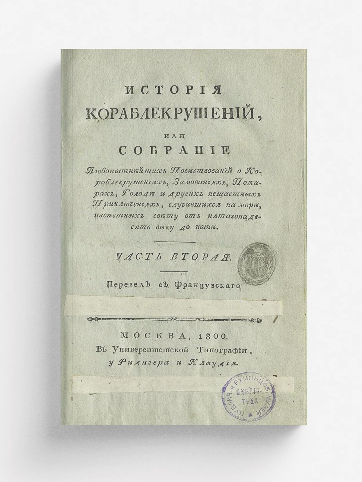 Деперт, Жан Луи Юбер Симон (1730–1792). История кораблекрушений, или Собрание любопытнейших повествований о кораблекрушениях, зимованиях, пожарах, голоде и других нещастных приключениях случившихся на море, известных свету от пятагонадесять веку до ныне. / Перевел с французскаго Гр[игорий] Я[ценков]. — Москва : В Университетской типографии, у Ридигера и Клаудия, 1799–1800. — 8° (21 см). Ч.2 [Текст]. — 1800. — VIII, 467, [1] с., 2 л. ил.