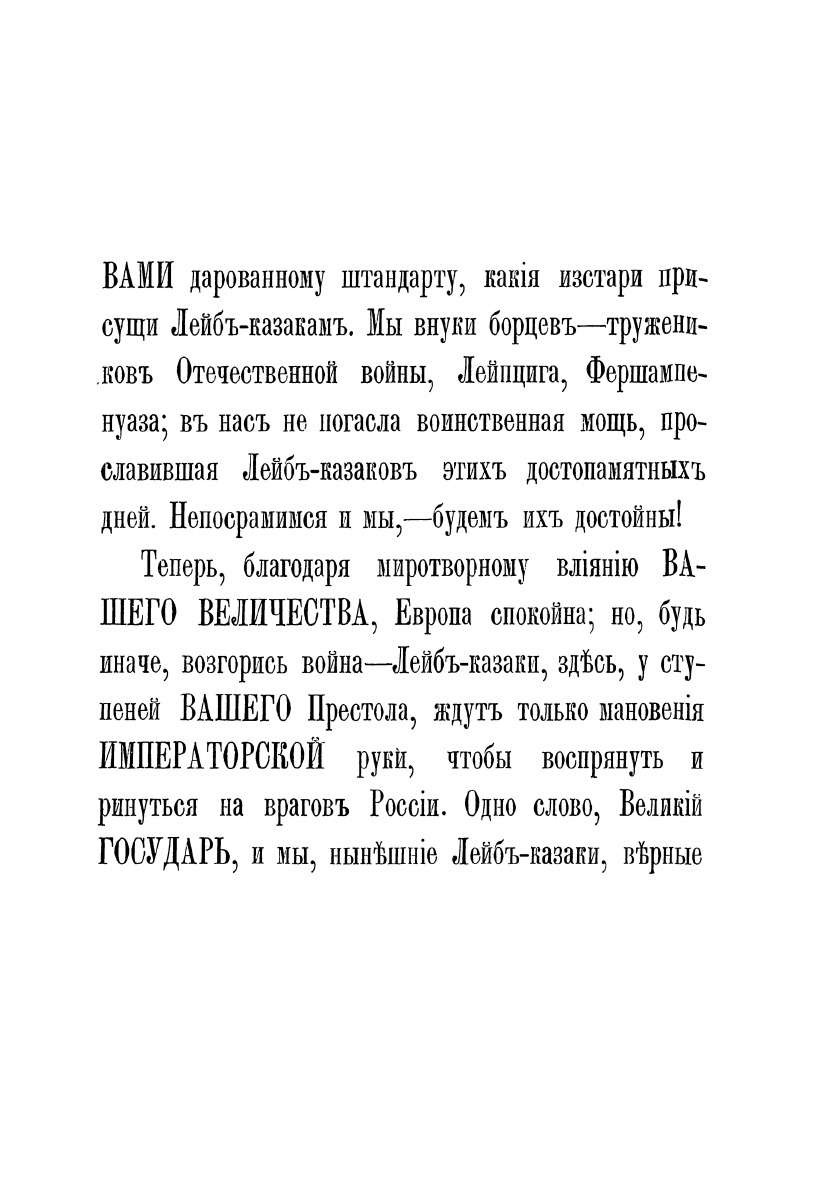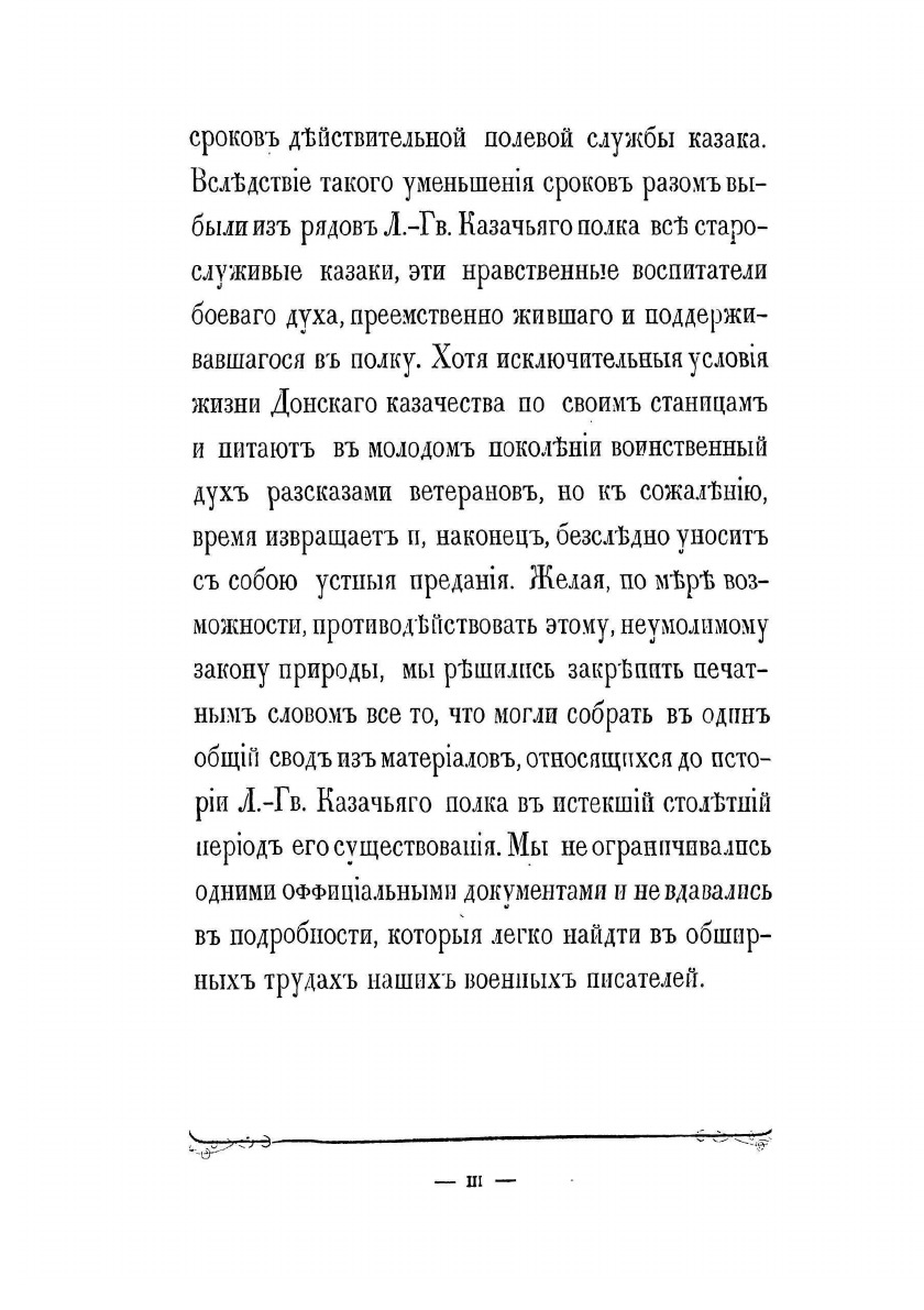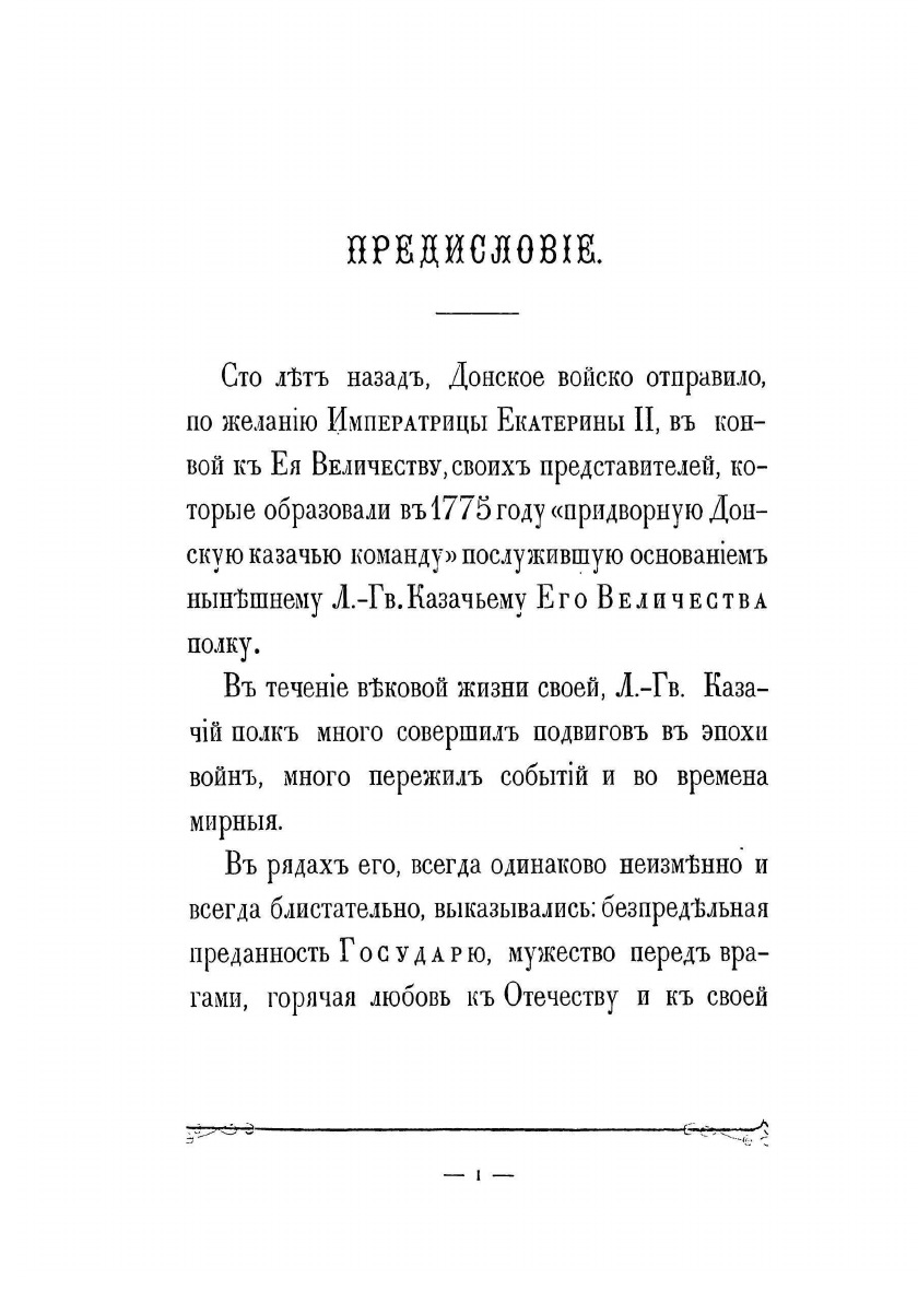Фундаментальная история полка подготовлена его офицерами в связи с празднованием 100-летнего юбилея и 50-летием шефства над полком особы императора. Лейб-гвардии казачий полк ведет свою историю от Донской казачьей команды, присланной к императорскому двору 20 апреля 1775 г. в правление Екатерины II. Инициатива в создании этого формирования исходила от князя Г.И. Потемкина, предложившего отправить в Москву на празднование годовщины Кучюк-Кайнаджирского мира две команды знатных казаков с Дона, которые и сформировали собственный императорский конвой, с 1776 г. получивший название «Донская придворная команда». После восшествия на престол Павла I в 1796 г. придворные казачьи команды объединены с казачьим полком гатчинских Его императорского высочества наследника цесаревича войск (этот полк был учрежден в 1793 г.), переформированы в два эскадрона, и составили половину Лейб-Гусарского Казачьего полка, которому были пожалованы права и преимущества гвардии. Через два года этот полк был разделен на два полка и с 1798 г. образован Лейб-гвардии Казачий полк.В 1805 г. в составе конной гвардии полк участвовал в сражении под Аустерлицем, где отбросил кавалерию французов, оказав помощь лейб-гусарам и кавалергардам, прикрывавшим гвардейскую пехоту, а затем в составе арьергарда П.И. Багратиона до поздней ночи прикрывал отступление русской пехоты. Впоследствии полк принимал активное участие в русско-шведской войне за Финляндию и Отечественной войне 1812 г., а также в заграничных походах. Интересен тот факт, что отряд лейб-гвардейцев казаков конвоировал Наполеона на о. Эльба в 1814 г. В царствование Николая I полк участвовал в русско-турецкой войне 1828–1829 гг. и подавлении польского восстания 1830–1831 гг. В период Крымской войны полк отвечал за безопасность двора и прикрывал побережье Финского залива. Основными функциями полка в 30-х- 70-х гг. XIX столетия были в основном придворно-церемониальные.