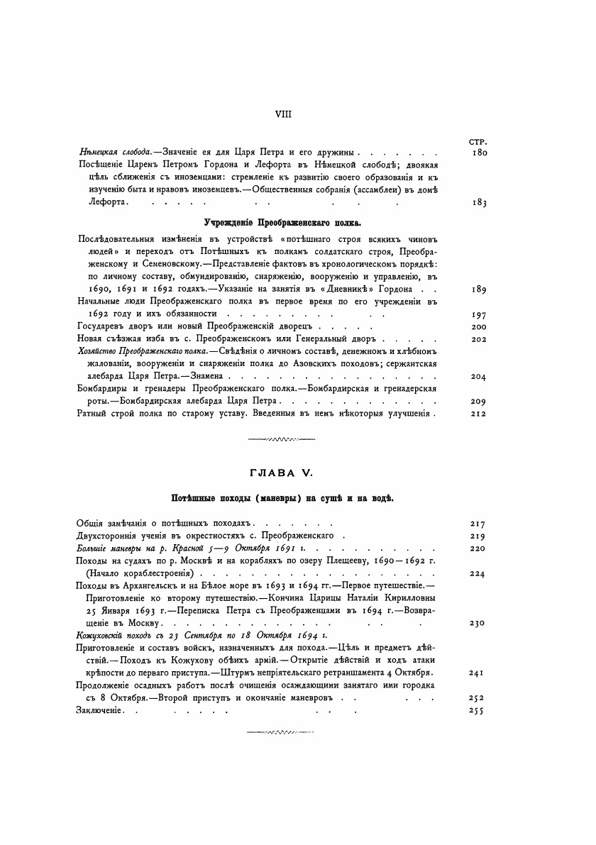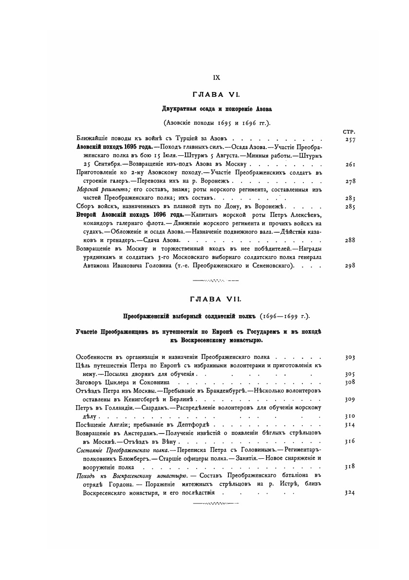 В 1900 году в Санкт-Петербурге вышло в свет двухтомное издание П.О. Бобровского, посвященное истории лейб-гвардии Преображенского полка. Свою историю полк ведет с 1683 года, с того момента, как царь Петр Алексеевич стал собирать вокруг себя в подмосковном селе Преображенском своих ровесников для Потешных игр.Автор книги Павел Осипович Бобровский (1823–1905 гг.) – военный педагог и юрист, знаток истории организации русской армии. Научное военно-историческое наследие Бобровского обширно и многогранно. Работая над книгой, Бобровский изучал и систематизировал полковые документы: дела полкового архива и приказы по полку. На основании полученных сведений им была подготовлена книга в двух томах с двумя томами приложений, дополняющих текст. Издание сопровождалось портретами в черно-белом исполнении и в красках, а также планами, картами, копиями писем Петра I к своей матери - царице Наталье Кирилловне.