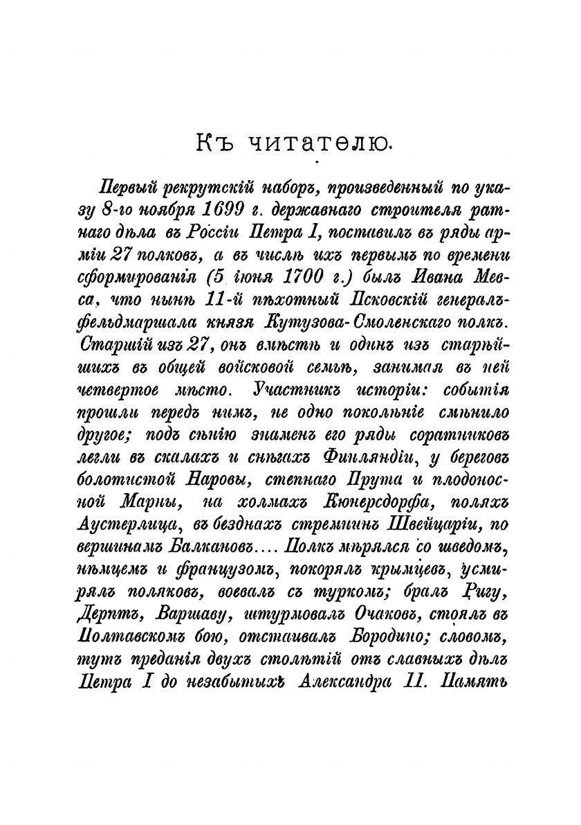 Документальное описание боевых действий полка и знаменательных исторических событий, связанных с ним, за период 1700 1881 годов. Приведены поименные списки полковых командиров и офицеров, награжденных орденами и знаками отличия, перемены в обмундировании и вооружении полка
