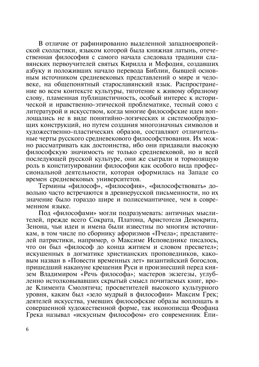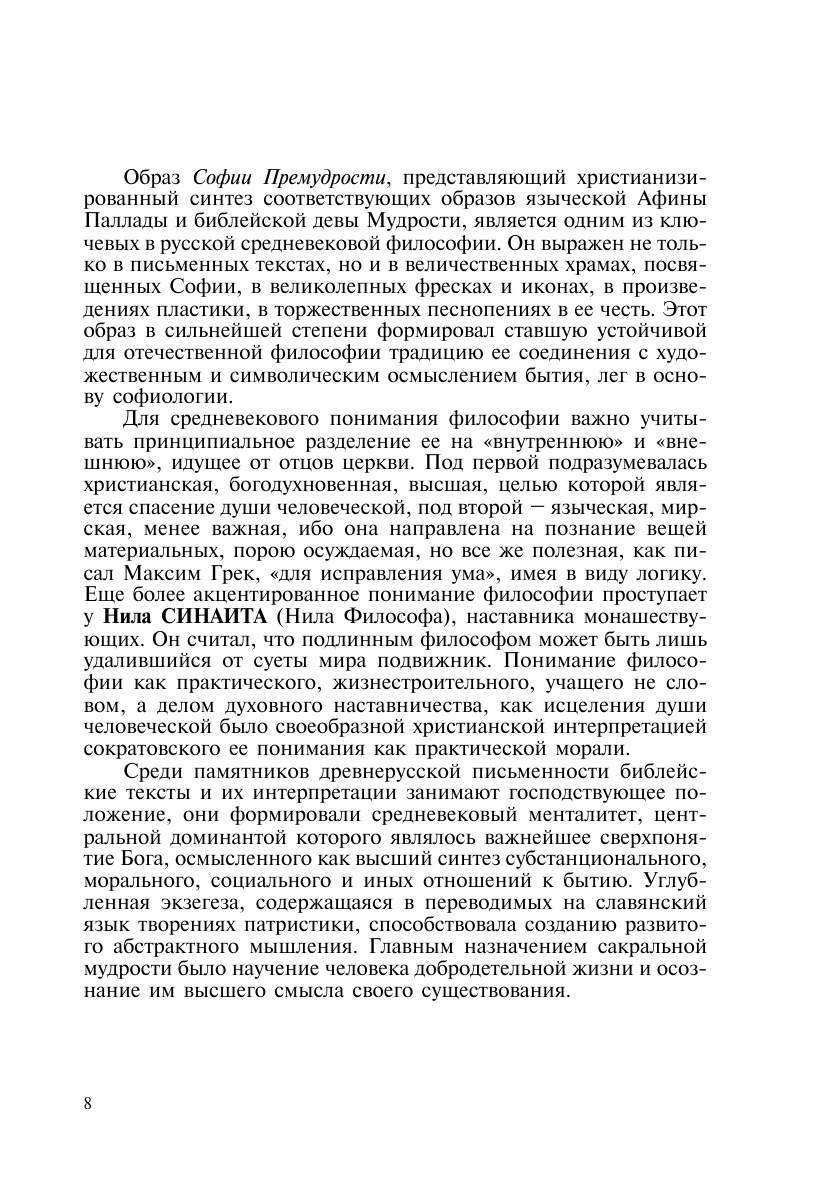 В пособии излагаются основы курса отечественной философской мысли от ее зарождения после крещения Руси до современности. Первый раздел посвящен философской мысли допетровского времени, включая эпоху барокко ХVII в., второй – ХVIII столетию, третий – важнейшим течениям ХIХ века, четвертый представляет краткое введение в историю русской философии ХХ века. Тысячелетний путь эволюции отечественного мышления рассматривается как единый, непрерывный процесс с присущими ему характеристиками: повышенным интересом к моральной, антропологической, историософской проблематике, учительной и просветительской направленностью, стремлением выражать идеи более в пластичной, нежели дискуссионной форме, многовариантностью развития.