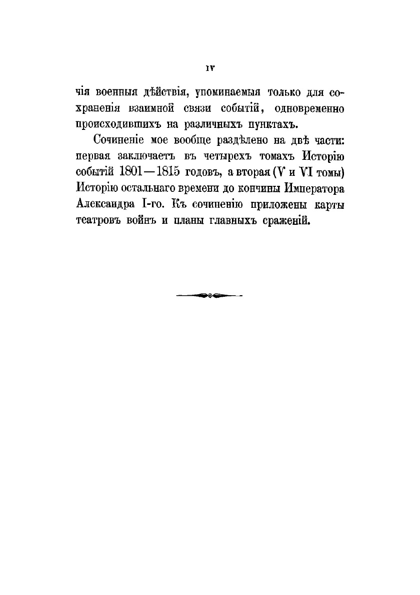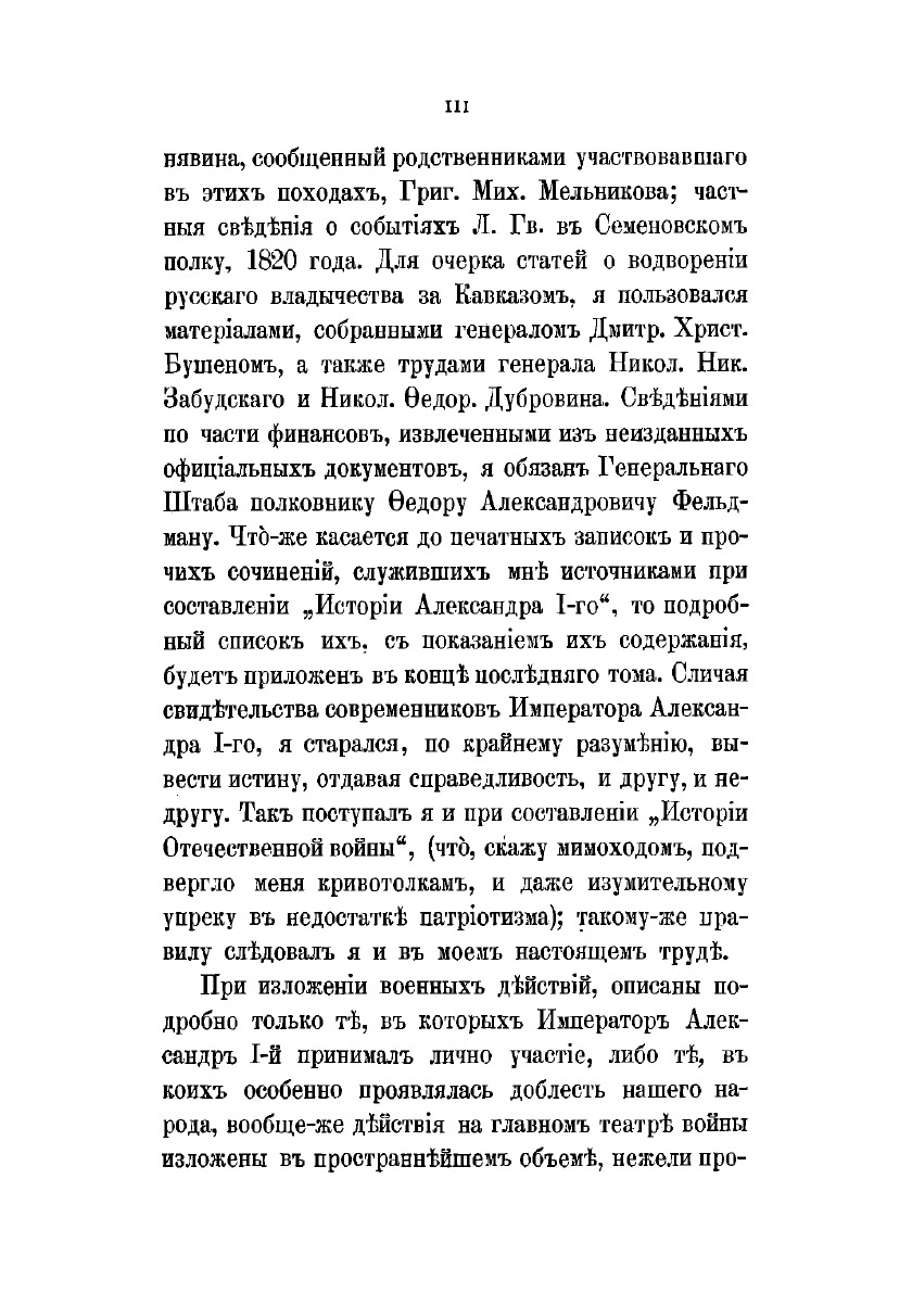 «История царствования императора Александра I и России в его время» вышла в свет в 1869–1871 гг. Ее автор, Богданович Модест Иванович (1805–1882), — генерал-лейтенант, военный писатель. В 1831 г. участвовал в сражениях под Вавром, Гроховым, Дембе-Вельке и Рагозиным. Пройдя курс в военной академии, занял в ней кафедру военной истории и стратегии, был членом Военного совета, официальным военным историографом. Оставил после себя множество военно-исторических и исторических трудов, в которых интересуется, главным образом, политической историей; его попытки критически отнестись к создавшимся легендам были встречены официальными историками весьма недоброжелательно. Повествование разделено на две части: первая, заключающаяся в I–IV томах, охватывает события 1801–1815 гг.; вторая — V, VI тома — содержит исторический период после 1815 г. до кончины Александра I в 1825 г. При создании книги Богданович использовал сведения из государственных архивов, а также до того не издававшиеся документы: бумаги императора Александра I, графа П. А. Строганова, записки адмирала А. С. Шишкова, журнал морских походов Д. Н. Сенявина и др. Полный список источников, печатных книг и рукописей, приведен в конце шестого тома. Богатый фактический материал иллюстрируют карты театров военных действий и планы главных сражений.