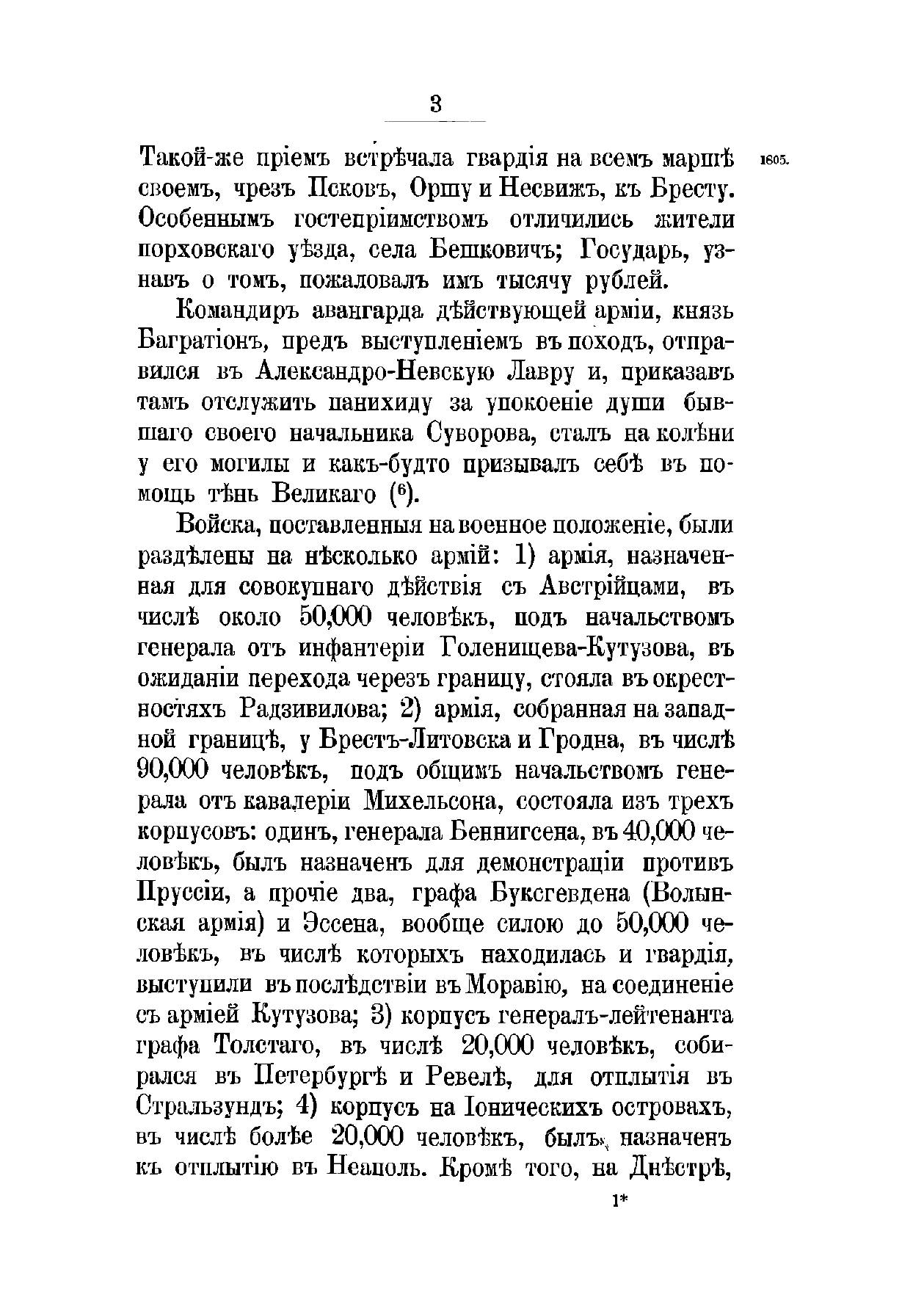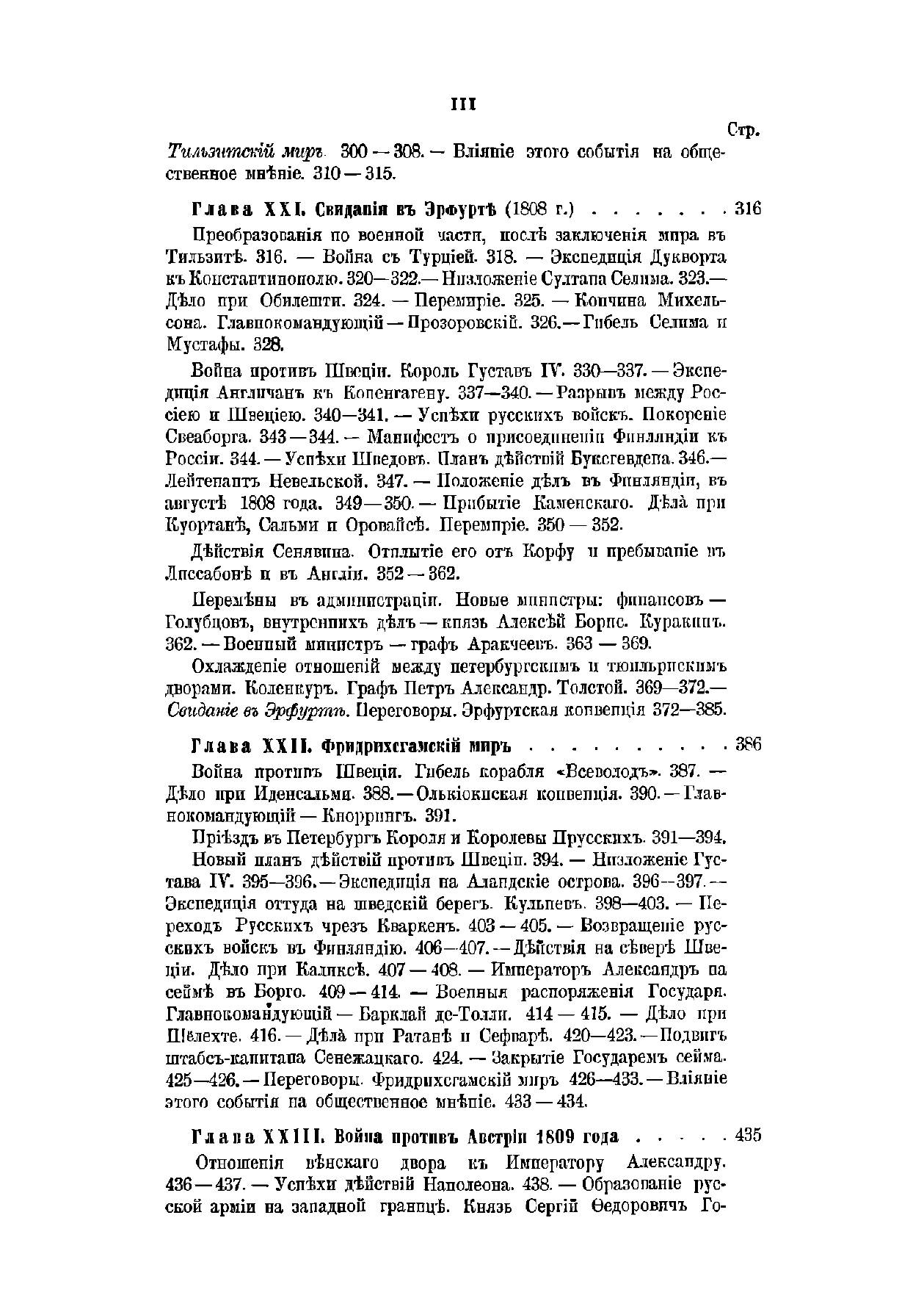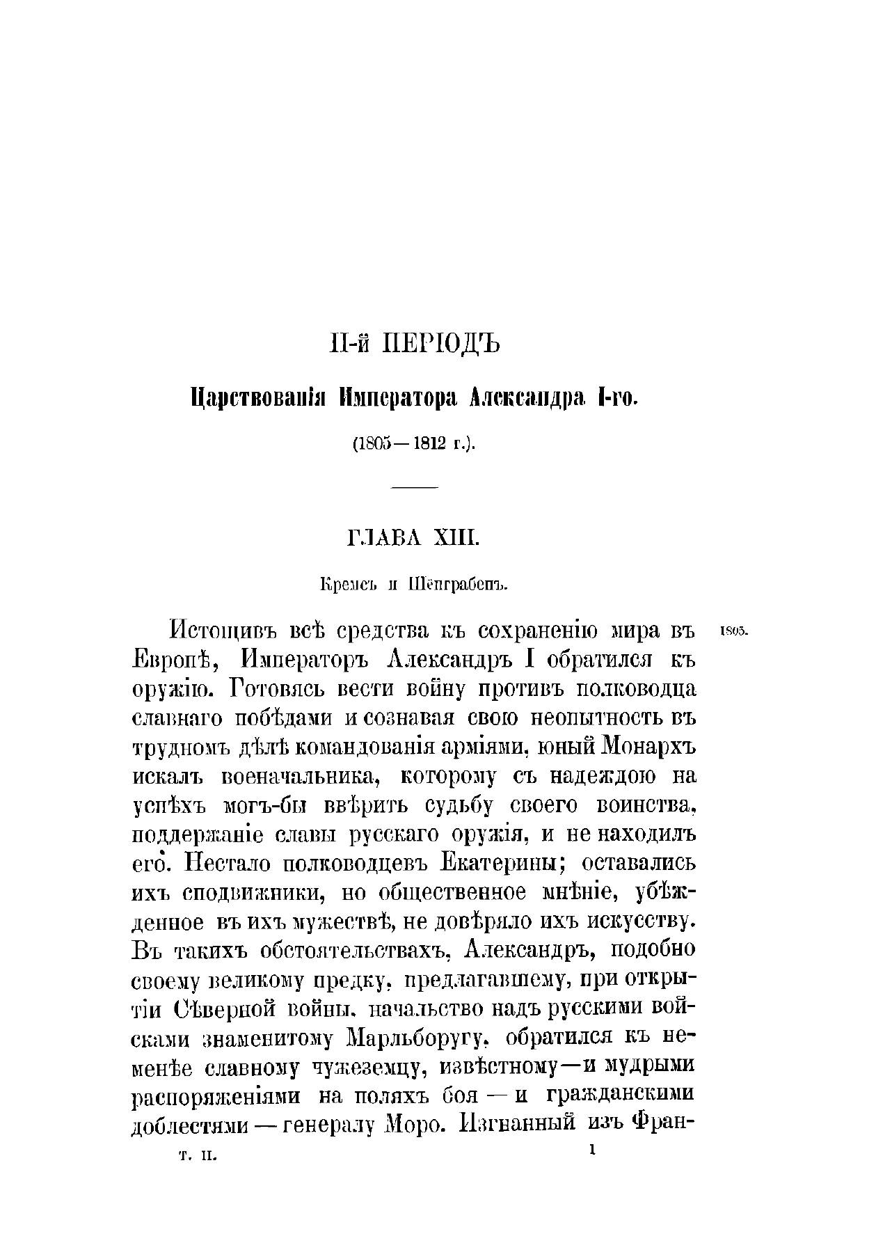 «История царствования императора Александра I и России в его время» вышла в свет в 1869–1871 гг. Ее автор, Богданович Модест Иванович (1805–1882), — генерал-лейтенант, военный писатель. В 1831 г. участвовал в сражениях под Вавром, Гроховым, Дембе-Вельке и Рагозиным. Пройдя курс в военной академии, занял в ней кафедру военной истории и стратегии, был членом Военного совета, официальным военным историографом. Оставил после себя множество военно-исторических и исторических трудов, в которых интересуется, главным образом, политической историей; его попытки критически отнестись к создавшимся легендам были встречены официальными историками весьма недоброжелательно. Повествование разделено на две части: первая, заключающаяся в I–IV томах, охватывает события 1801–1815 гг.; вторая — V, VI тома — содержит исторический период после 1815 г. до кончины Александра I в 1825 г. При создании книги Богданович использовал сведения из государственных архивов, а также до того не издававшиеся документы: бумаги императора Александра I, графа П. А. Строганова, записки адмирала А. С. Шишкова, журнал морских походов Д. Н. Сенявина и др. Полный список источников, печатных книг и рукописей, приведен в конце шестого тома. Богатый фактический материал иллюстрируют карты театров военных действий и планы главных сражений.