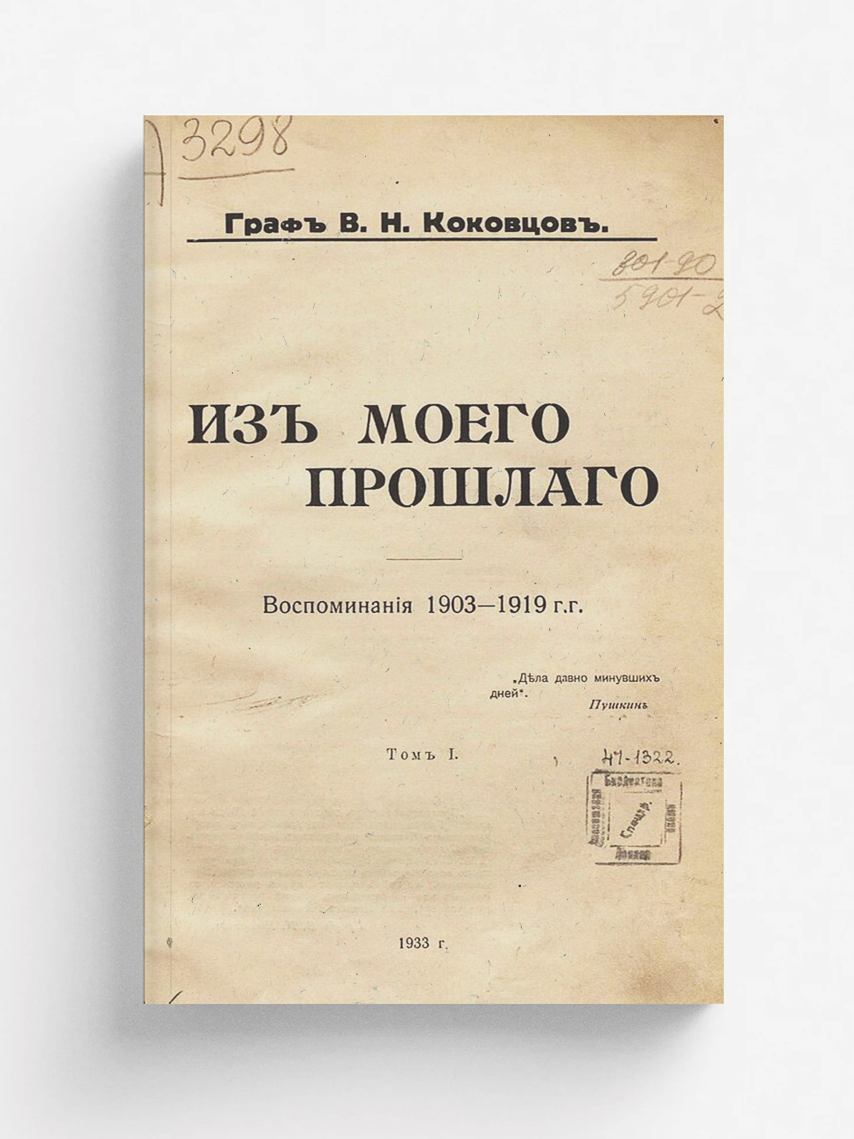 Коковцов, Владимир Николаевич. Из моего прошлого : Воспоминания, 1903–1919 г.г. — Париж : Иллюстрированная Россия, 1933. — 25 см. Т. 1 [Текст]. — 1933. — 505, [7] с.