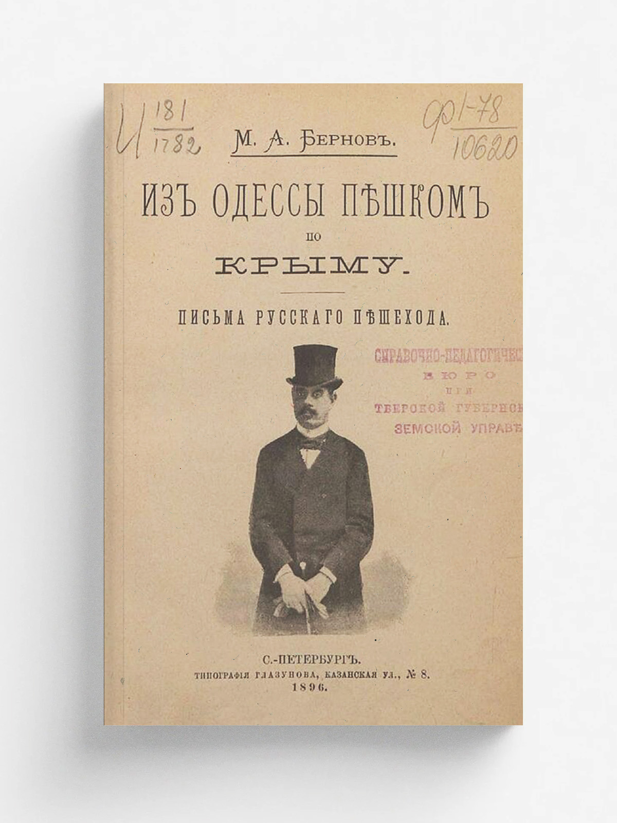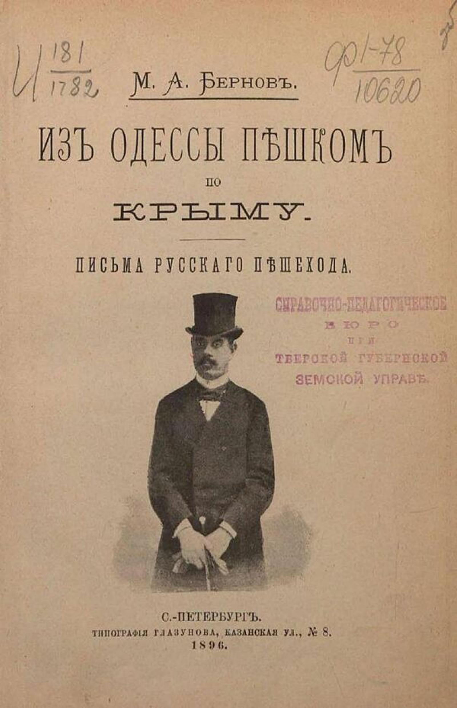 Бернов, Михаил Александрович (1864–). Из Одессы пешком по Крыму. Письма русского пешехода / М. А. Бернов. — Санкт-Петербург: тип. Глазунова, 1896. — [4], IV, 218 с., 1 л. фронт. (ил.); 20.