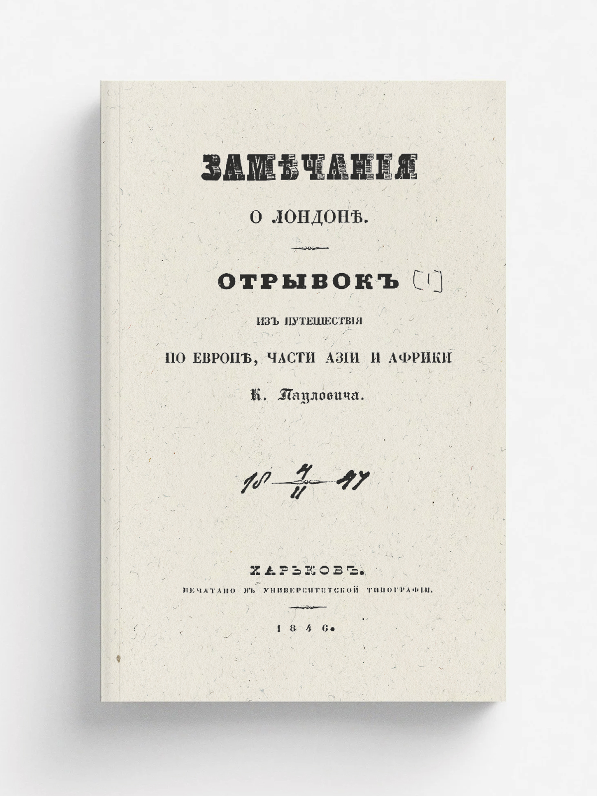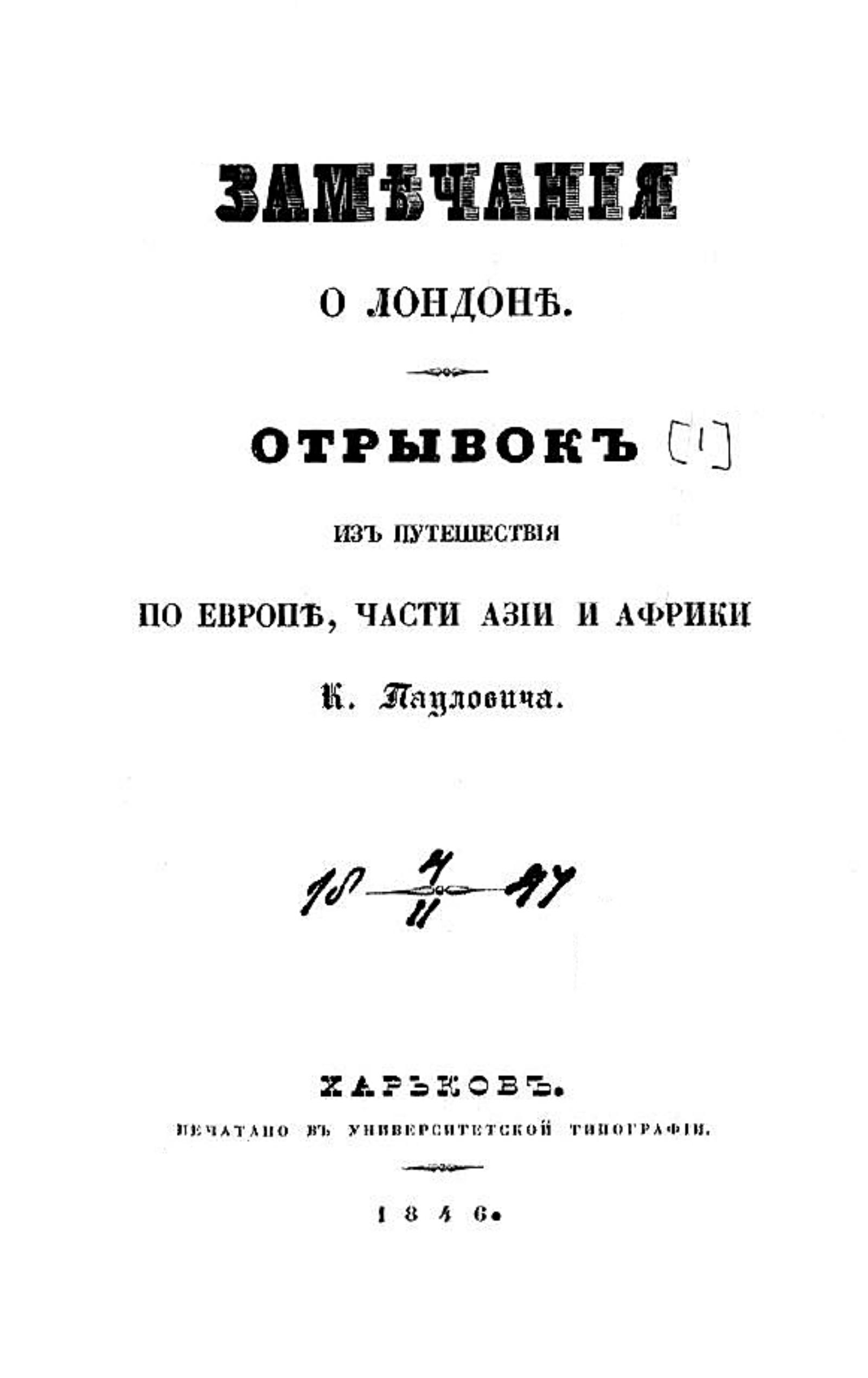 Паулович, Константин Павлович (1781–1860). Из путешествия по Европе, части Азии и Африки / [Соч.] К. Пауловича. Отрывок [1]-. — Харьков : Унив. тип., 1846-1861. — 22. Замечания о Лондоне. - 1846. - [8], XIV, 530, XVI с., 1 л. план.