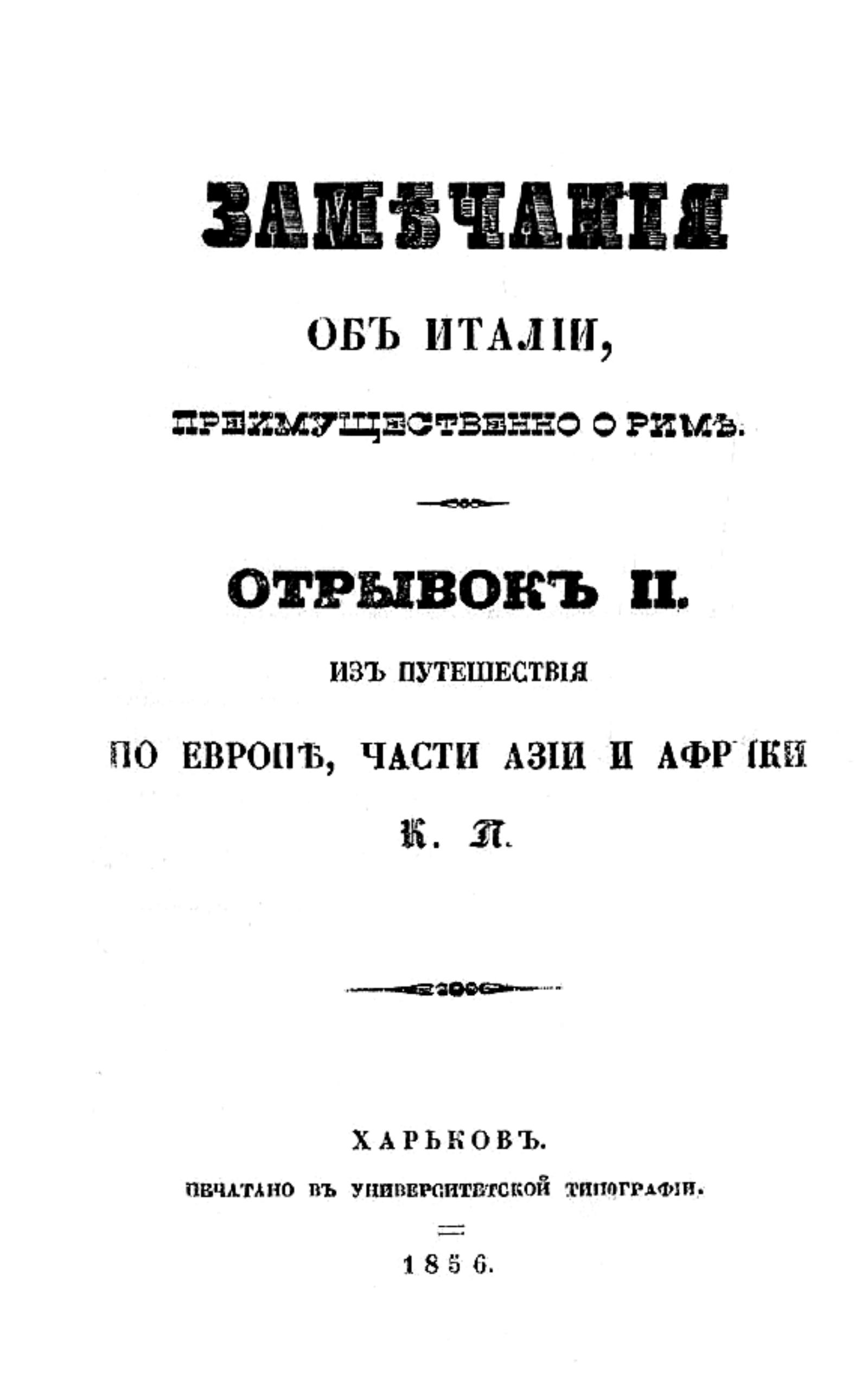 Паулович, Константин Павлович (1781–1860). Из путешествия по Европе, части Азии и Африки / [Соч.] К. Пауловича. Отрывок [1]-. — Харьков : Унив. тип., 1846-1861. — 22. Замечания об Италии, преимущественно о Риме. — 1856. — [2], 844 с., 2 л. ил.