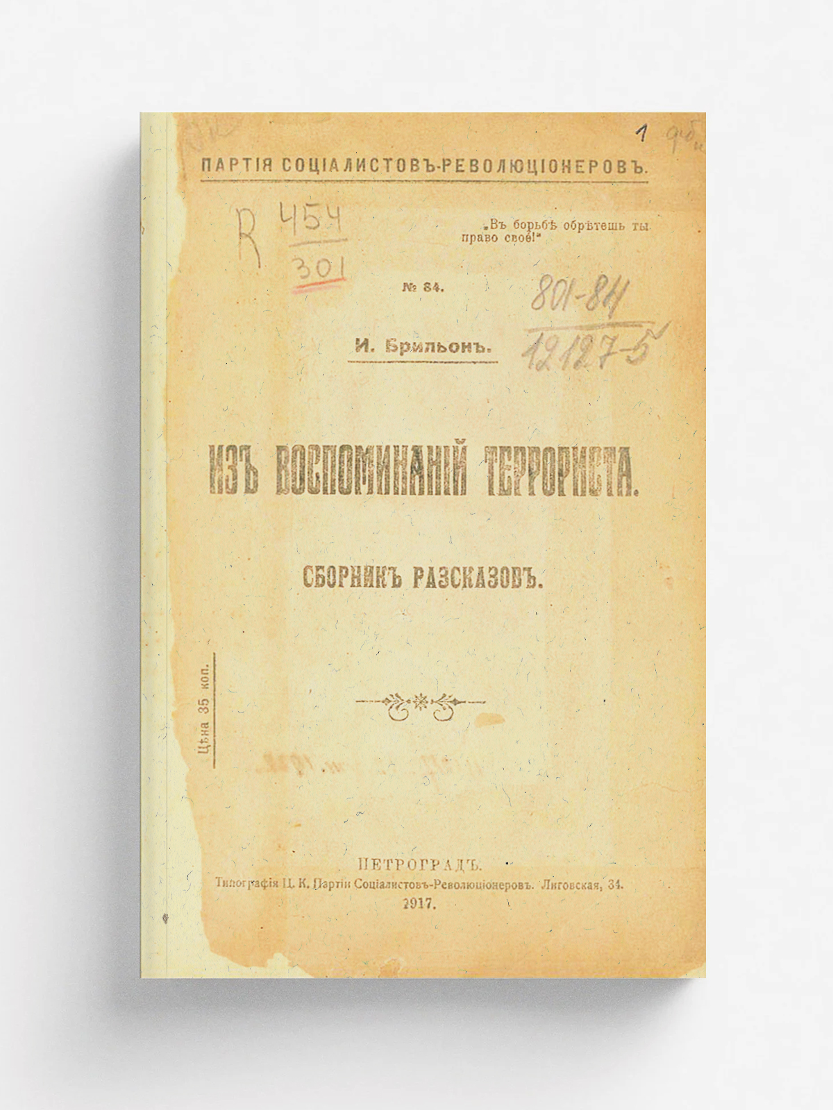 Брильон, Израиль Нисонович. Из воспоминаний террориста : Сб. рассказов / Партия социалистов-революционеров; И. Брильон. — Петроград : тип. ЦК Партии социалистов-революционеров, 1917. — 31 с.; 21.