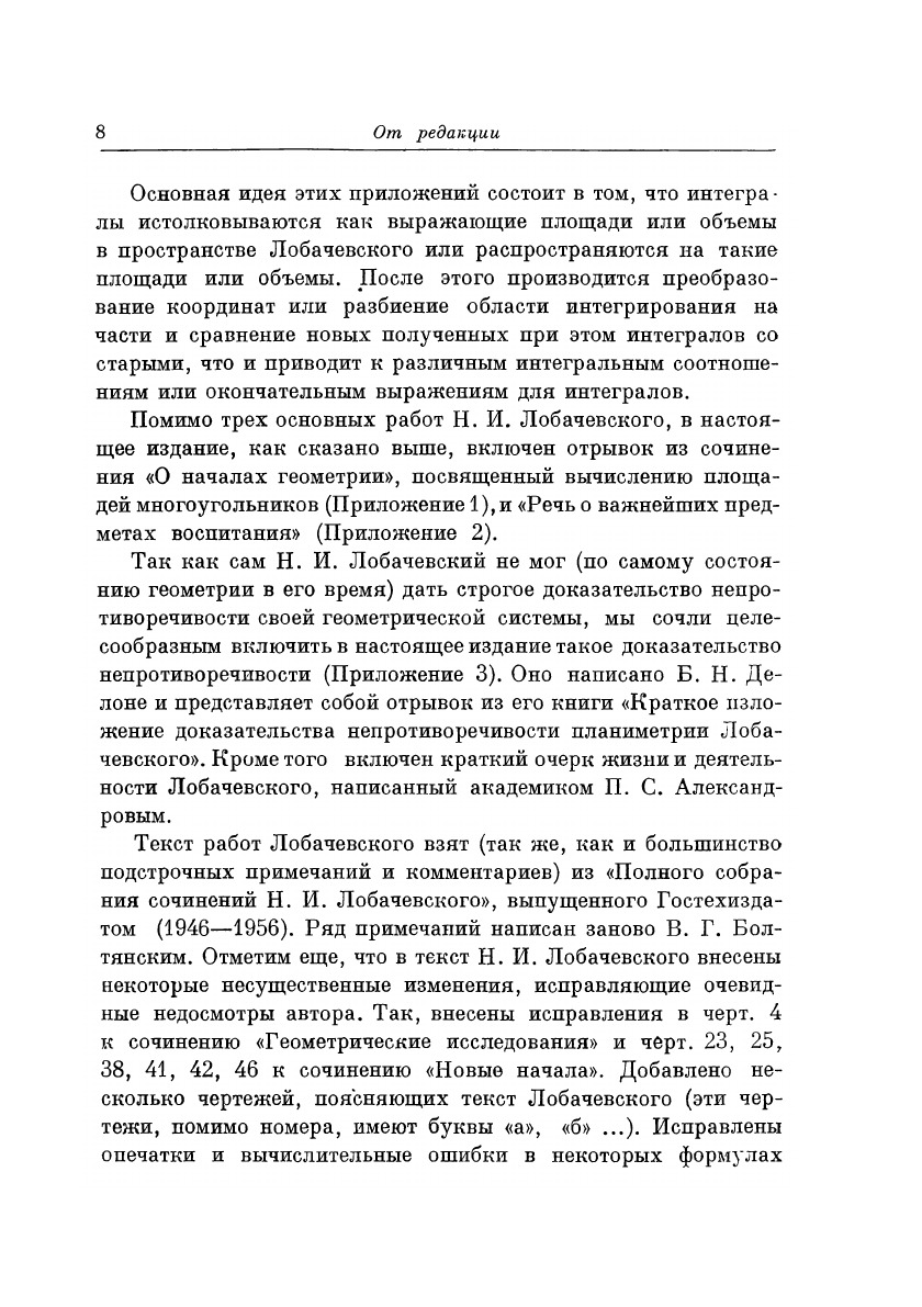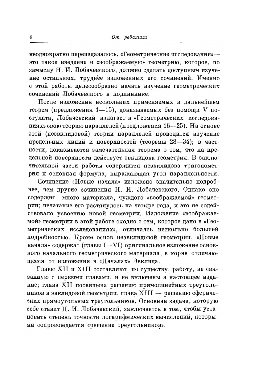 В феврале 1956 года исполнилось 100 лет со дня смерти великого русского математика Николая Ивановича Лобачевского и 130 лет существования созданной им геометрической системы. В настоящее, юбилейное издание, выпускаемое в связи с этой датой, включены три сочинения Н. И. Лобачевского: «Геометрические исследования по теории параллельных линий», «Новые начала геометрии с полной теорией параллельных линий» и «Воображаемая геометрия».