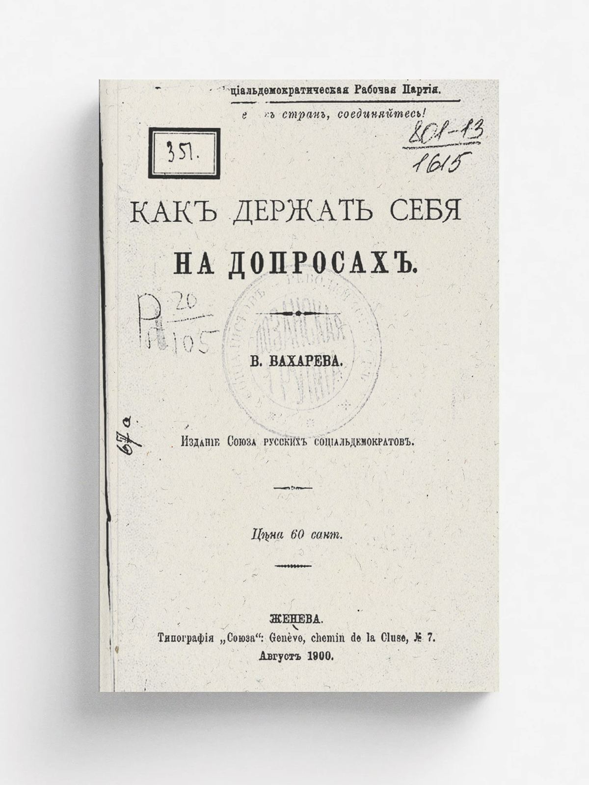Акимов, Владимир Петрович. Как держать себя на допросах / В. Бахарева ; Российская социал-демократическая партия. — Женева : Союз русских социал-демократов, 1900 (Тип. Союза [русских социал-демократов]). — 47 с.; 17 см.