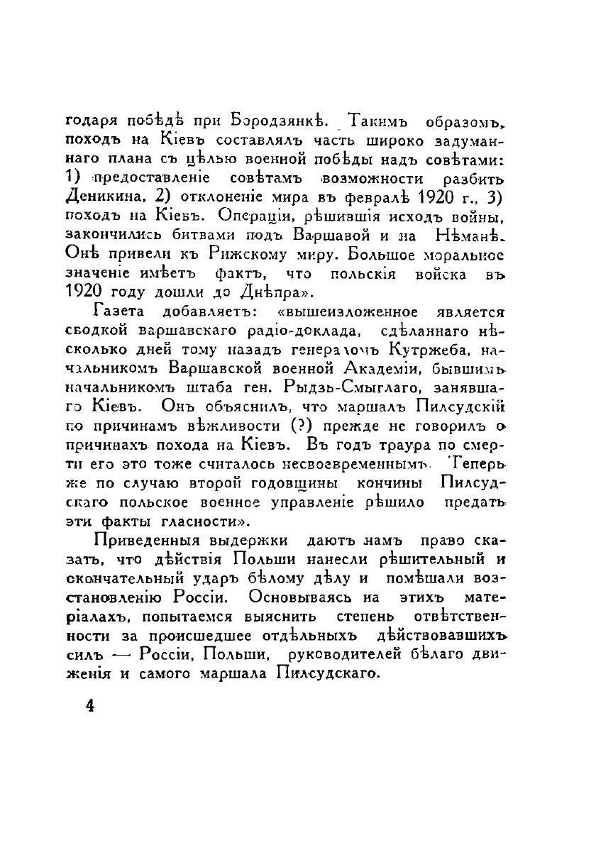 Ныне вниманию читателей предлагается новый труд, посвященный политике Польши в отношении белого движения: "Как Пилсудский погубил Деникина". Оказывается, что политика Пилсудского была подсказана определеннным стремлением ни в каком случае не допустить национального возрождения России, и что никакие уступки не могли побудить Польшу отказаться от этого стремления, проистекавшего из воспоминаний о былых обидах и жажды мести за 125-летнее угнетение. Репринтное издание по технологии print-on-demand с оригинала 1938 года