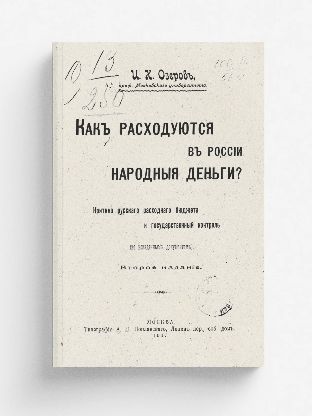 Озеров, Иван Христофорович (1869–1942). Как расходуются в России народные деньги? : Критика рус. расход. бюджета и гос. контроль : (По неизд. документам) / И. Х. Озеров, проф. Моск. ун-та. — 2-е изд. — Москва : тип. А. П. Поплавского, 1907. — VIII, 310, II с.; 20.