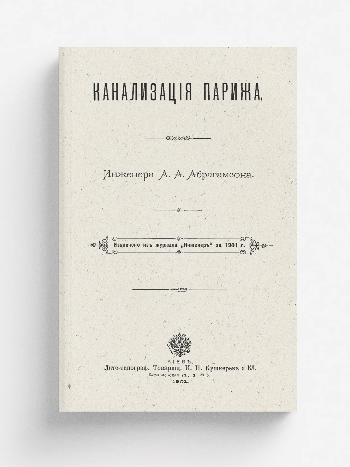 Абрагамсон, Артур Адольфович (1854–1924). Канализация Парижа / [Соч.] Инж. А. А. Абрагамсона. — Киев : лито-тип. т-ва И. Н. Кушнерев и К°, 1901. — 16 с., 1 л. черт. : табл.; 25.