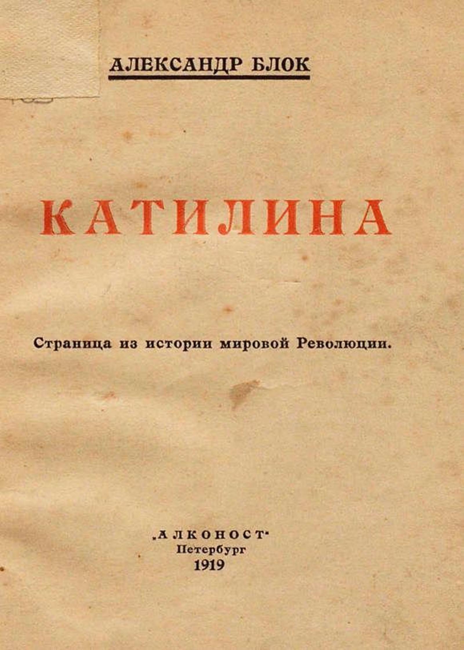 Блок, Александр Александрович. Катилина : [cтраница из истории мировой революции] / Александр Блок. — Петербург : Алконост, 1919. — 70 с., из них 2 с. объявл. : ил.; 16 см.