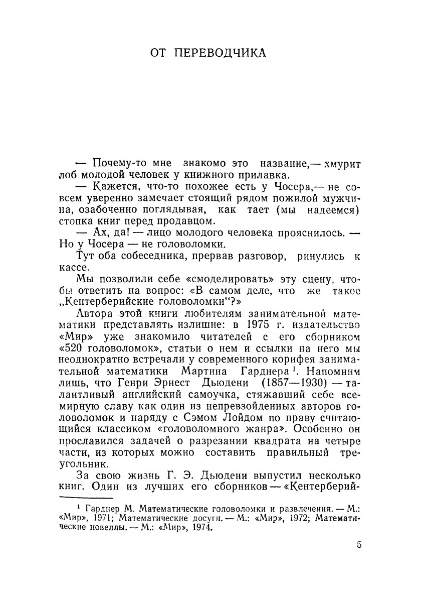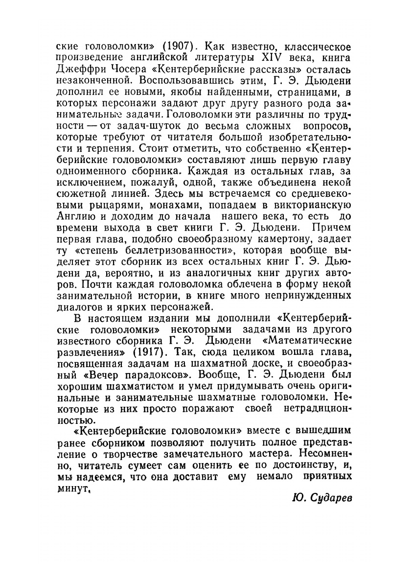 Сборник принадлежит перу одного из основоположников занимательной математики Генри Э. Дьюдени. Кроме беллетризованных задач на темы «Кентерберийских рассказов» Д. Чосера, в него вошло более 150 других логических, арифметических, геометрических, алгебраических задач и головоломок. Книга доставит удовольствие всем любителям занимательной математики.