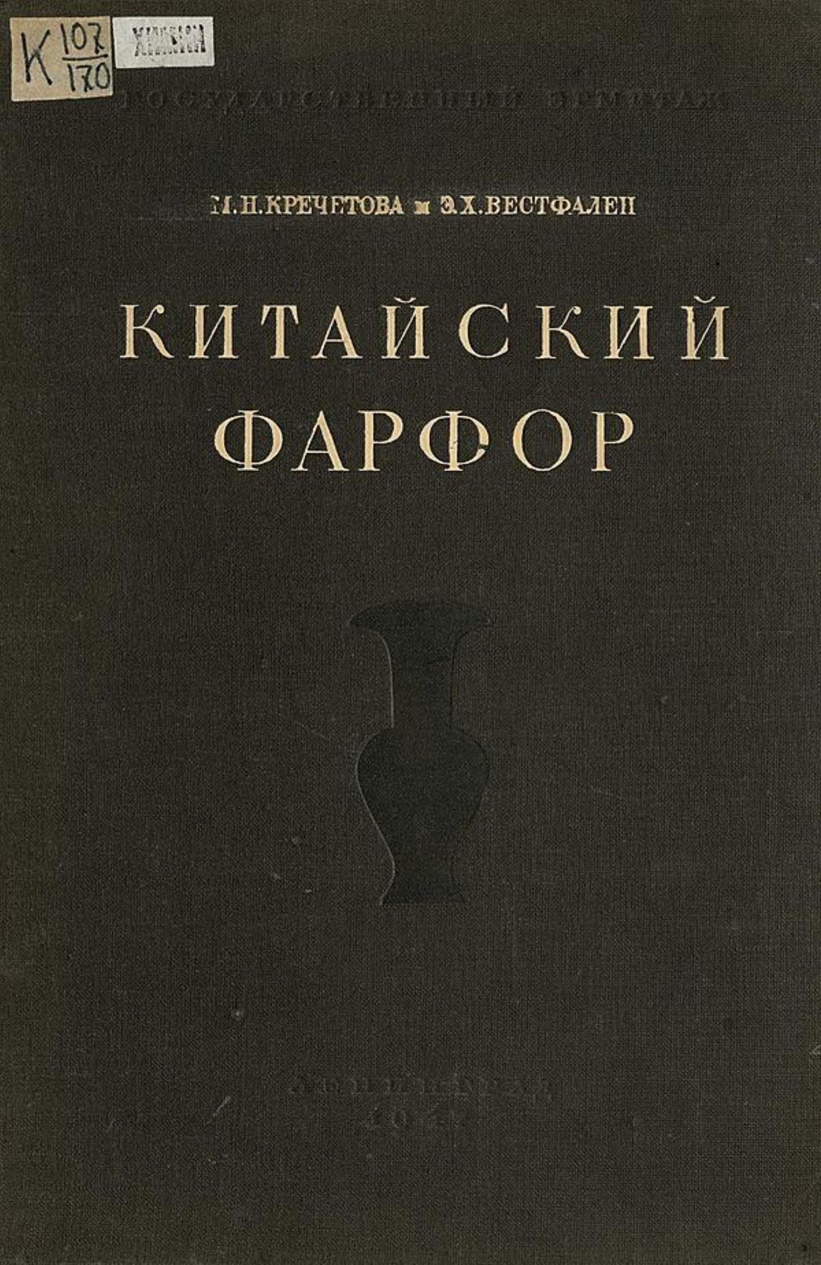 Вестфален, Эльза Христиановна. Китайский фарфор / Э. Х. Вестфален и М. Н. Кречетова ; Гос. Эрмитаж. — Ленинград : тип. «Коммунист», 1947 (Таллин). — 56 с. текста, XXX с. ил., 3 л. ил. : ил.; 28 см. На переплете 1-й авт.: М. Н. Кречетова