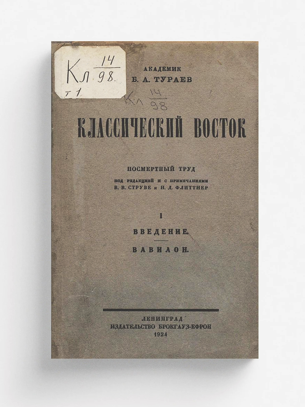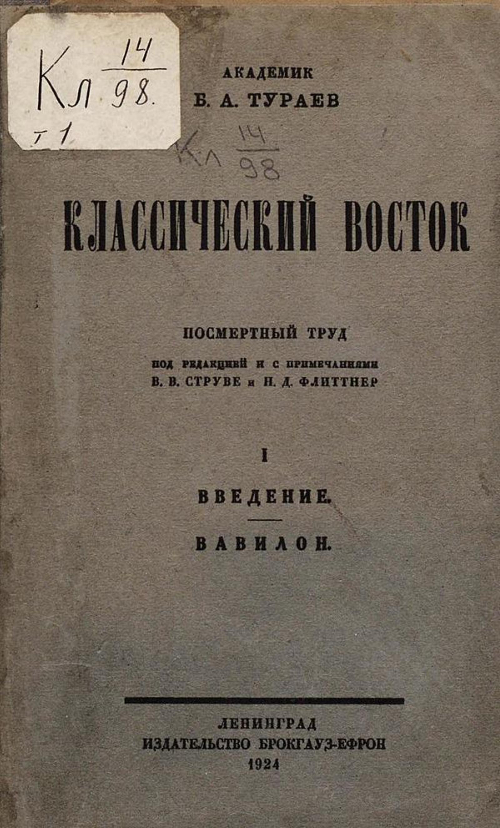 Тураев, Борис Александрович (1868–1920). Классический Восток. Том 1. Введение. Вавилон / акад. Б. А. Тураев ; под ред. [с предисл.] и с прим. В. В. Струве и Н. Д. Флиттнер. — Ленинград : Брокгауз-Ефрон, 1924. — 21 см.