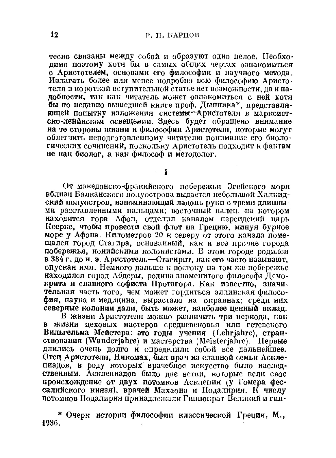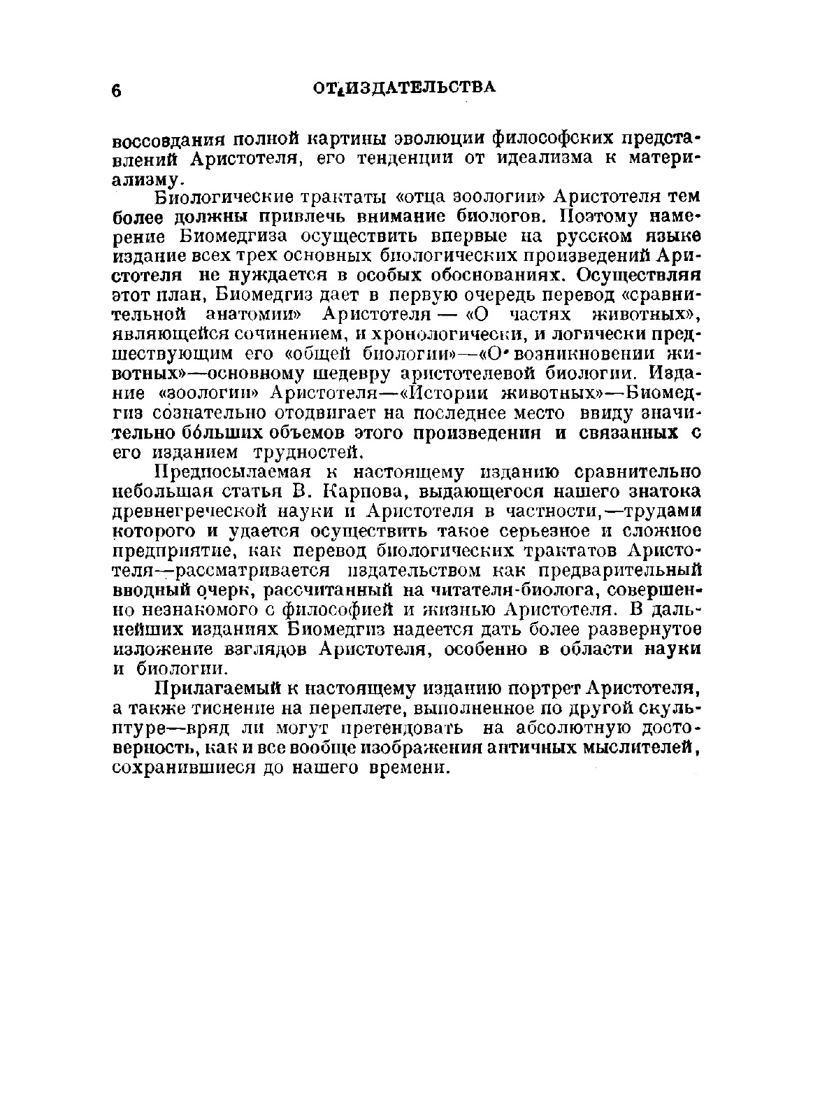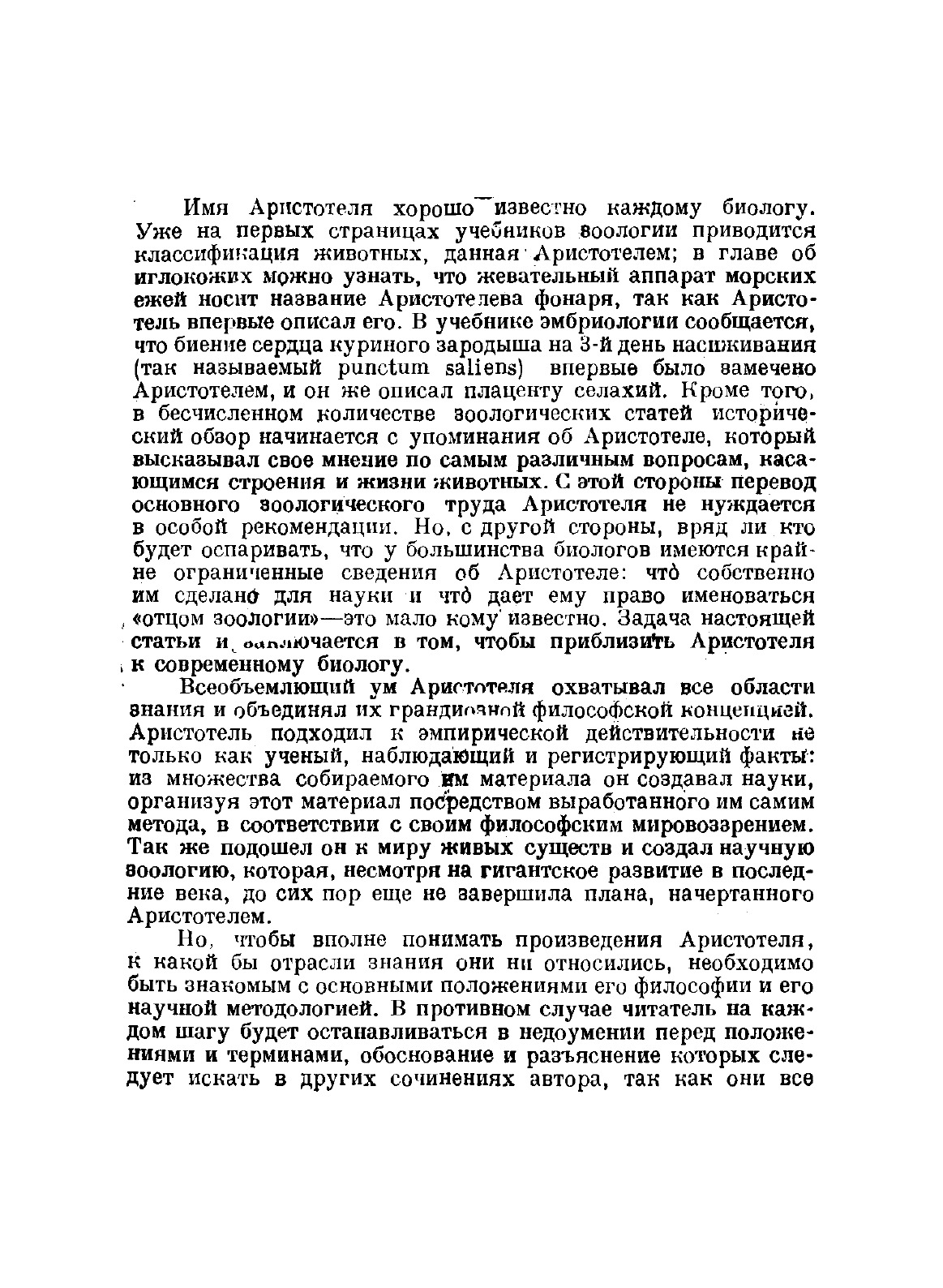 Величайший философ древности, Аристотель представляет для биологов первостепенный интерес. В его литературном наследстве сочинения по естествознанию занимают не менее значительное место, чем философские; биологические же трактаты Аристотеля издавна и по праву считались лучшими из его научных произведений. Более того, три основных шедевра аристотелевой биологии «История животных», «О частях животных» и «О возникновении животных» являются творениями наиболее зрелого периода творчества Аристотеля, в которых с наибольшей силой отразились его отход от платоновского идеализма и тенденция к материализму.