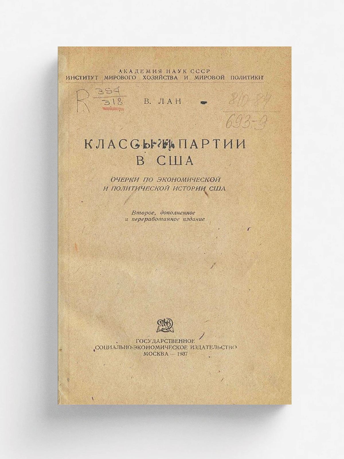 Лан, Вениамин Израилевич. Классы и партии в США : Очерки по экон. и полит. истории США / В. Лан; Акад. наук СССР. Ин-т мирового хоз-ва и мировой политики. — 2-е, доп. и перер. изд. — Москва : Соцэкгиз, 1937. — Обл., VI, 635 с.; 23 см.