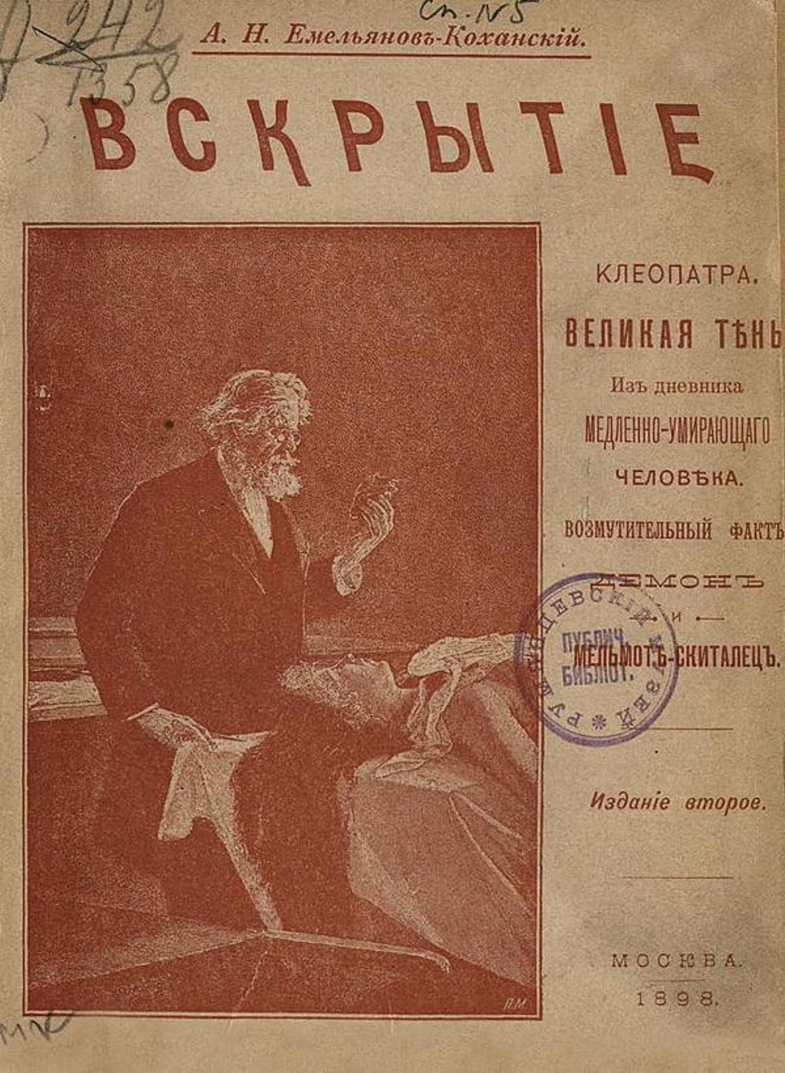 Емельянов-Коханский, Александр Николаевич (1871–1936). Клеопатра; Великая тень; Из дневника медленно умирающего человека; Возмутительный факт; Вскрытие; Демон и Мельмот; Скиталец : (Психол. этюды). — 2-е изд. — Москва : Аренд. типо-лит. Яковлевой, А. П. Поплавский, 1898. — [4], 155 с.; 16.