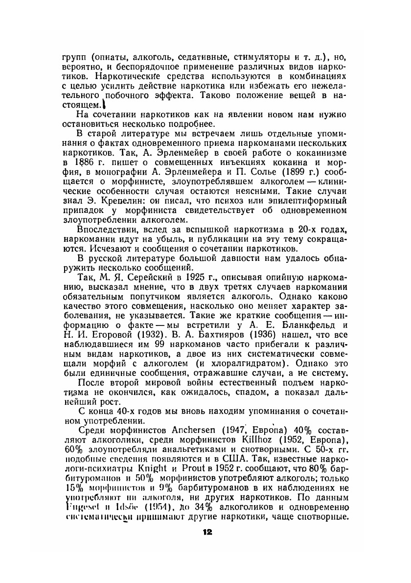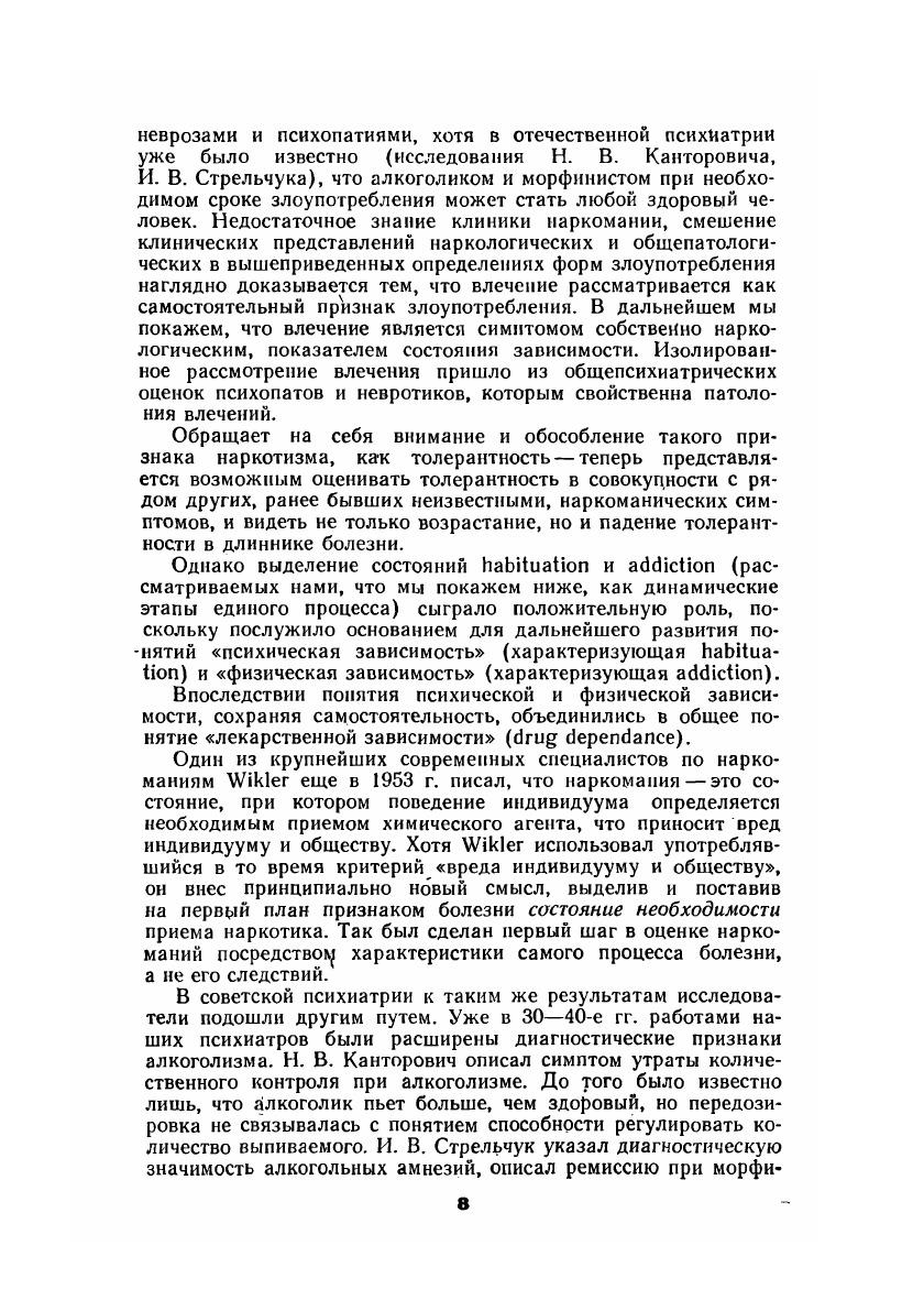 Монография охватывает широкий круг вопросов, связанных с проблемой наркоманической зависимости. Рассматриваются предпосылки (в том числе личностные) к образованию наркомании, закономерности формирования привыкания и пристрастия, общие клинические проявления наркоманической зависимости на различных этапах развития болезни. Описаны наиболее распространенные частные формы наркоманий, а также наблюдаемые в практике полинаркомании (пристрастие более чем к одному наркотическому средству), в частности алкогольные полинаркомании. Подробно освещены такие сложные вопросы наркологии, как диагностика наркоманической зависимости, особенно — диагностика скрываемой наркомании, маскируемой, например, алкоголизацией. Излагаются общие принципы лечения наркоманов, а также лечебная тактика при различных состояниях в течении наркомании (интоксикация, абстинентный синдром, принципы поддерживающей терапии в ремиссиях, медикаментозная помощь при рецидивах). Приводятся современные данные, в том числе собственные, об этиологии и патогенезе наркоманической зависимости. Специальная глава посвящена профилактике наркоманий. Книга представляет интерес для психиатров, невропатологов, практических врачей других специальностей, а также для психологов и социологов.