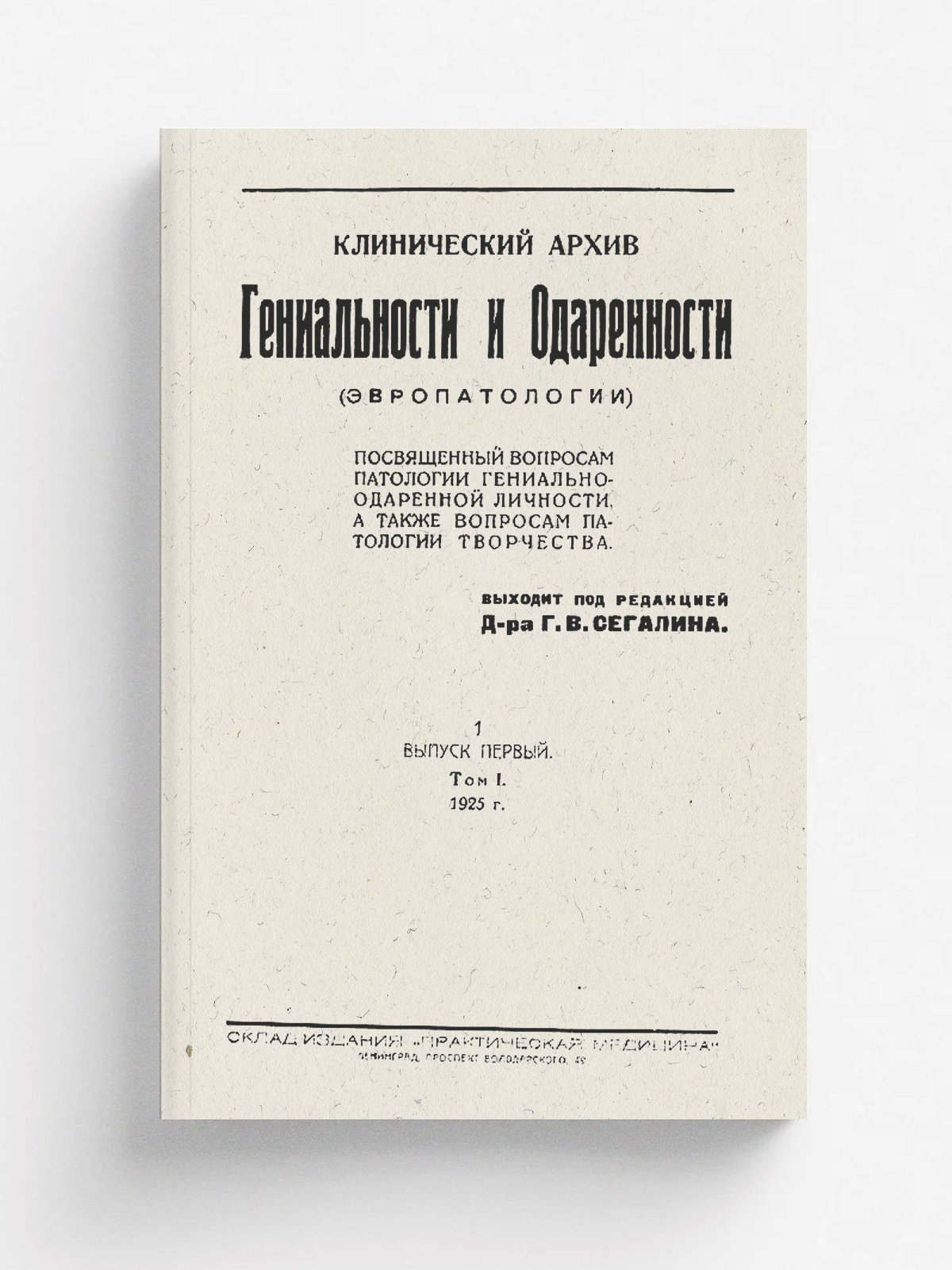 Клинический архив гениальности и одаренности (эвропатологии). 1925, Т. 1, № 1 / под ред. Г. В. Сегалина. — Ленинград : Склад изд. «Практическая медицина», 1925.