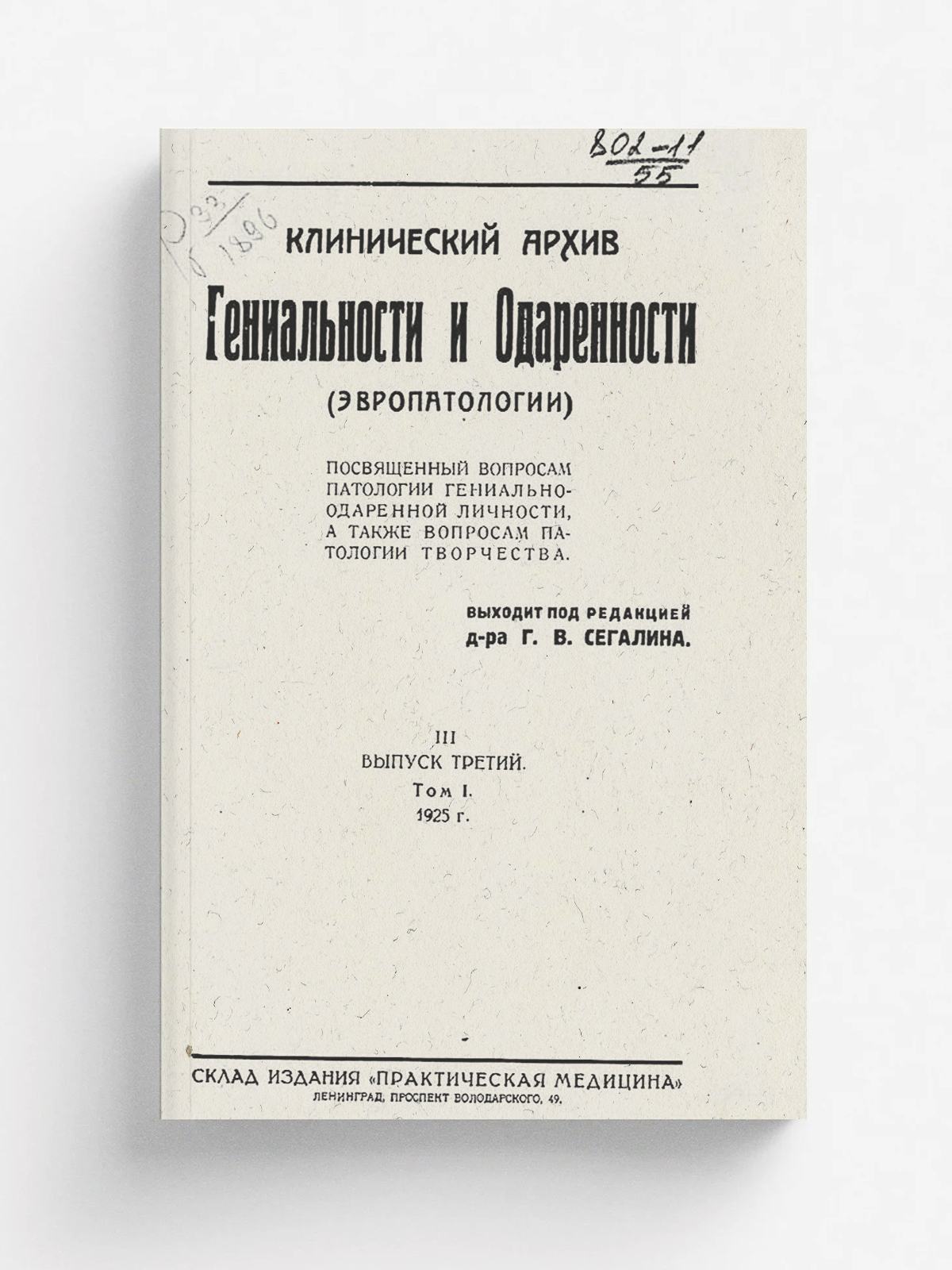 Клинический архив гениальности и одаренности (эвропатологии). 1925, Т. 1, № 3 / под ред. Г. В. Сегалина. — Ленинград : Склад изд. «Практическая медицина», 1925.
