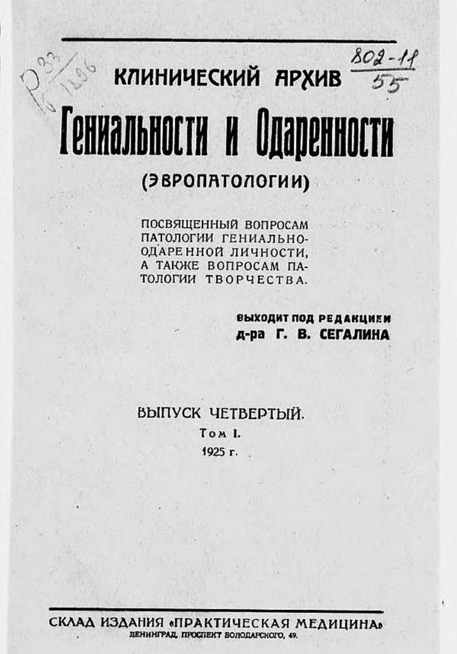 Клинический архив гениальности и одаренности (эвропатологии). 1925, Т. 1, № 4 / под ред. Г. В. Сегалина. — Ленинград : Склад изд. «Практическая медицина», 1925.