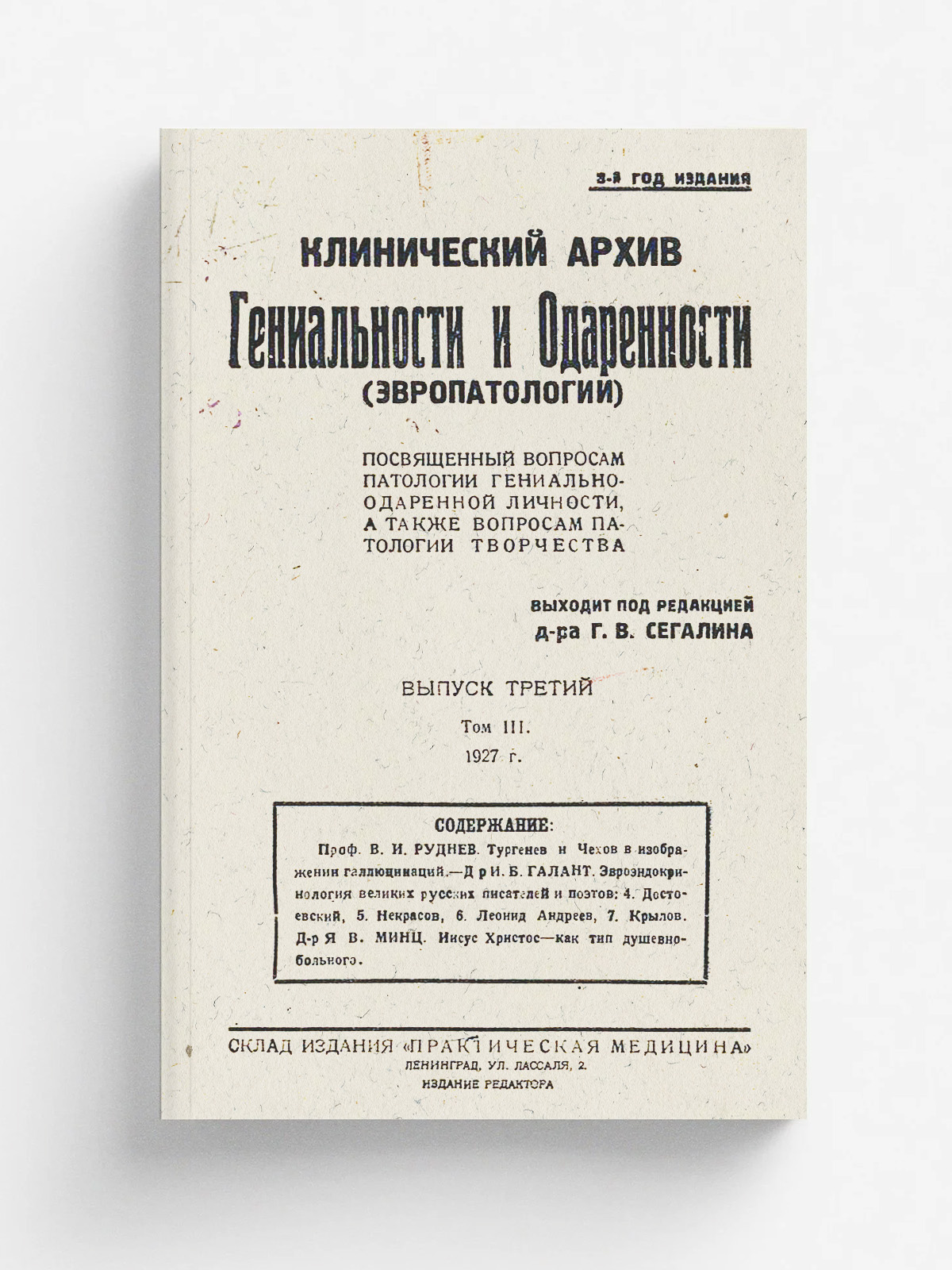 Клинический архив гениальности и одаренности (эвропатологии). 1927, Т. 3, № 3 / под ред. Г. В. Сегалина. — Ленинград : Склад изд. «Практическая медицина», 1927.