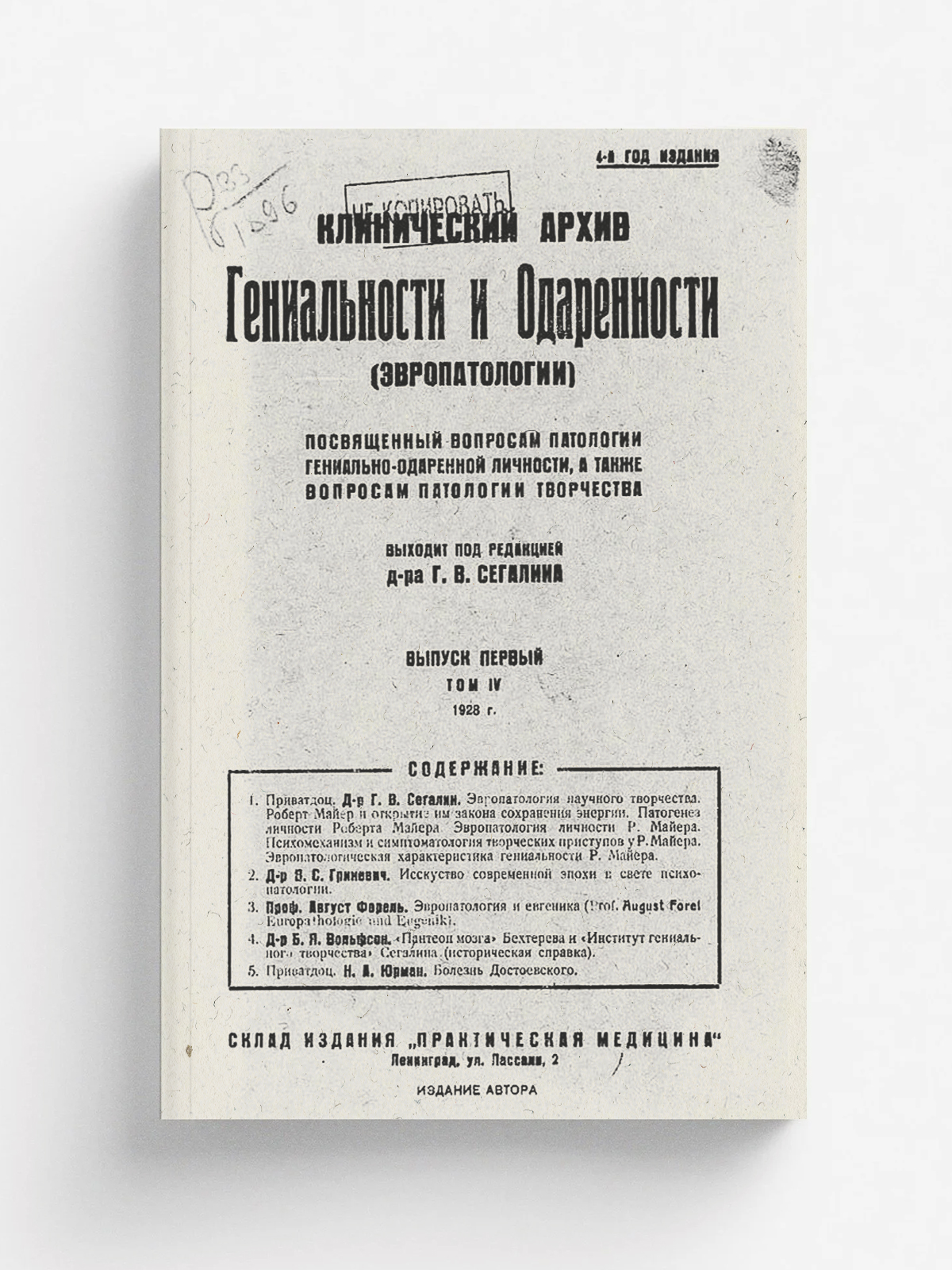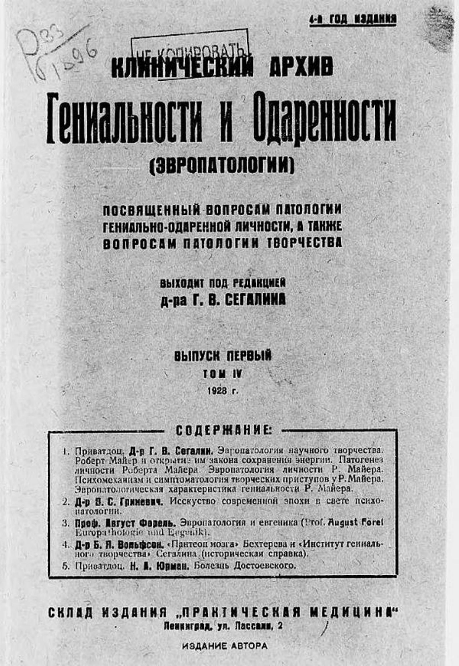 Клинический архив гениальности и одаренности (эвропатологии). 1928, Т. 4, № 1 / под ред. Г. В. Сегалина. — Ленинград : Склад изд. «Практическая медицина», 1928.