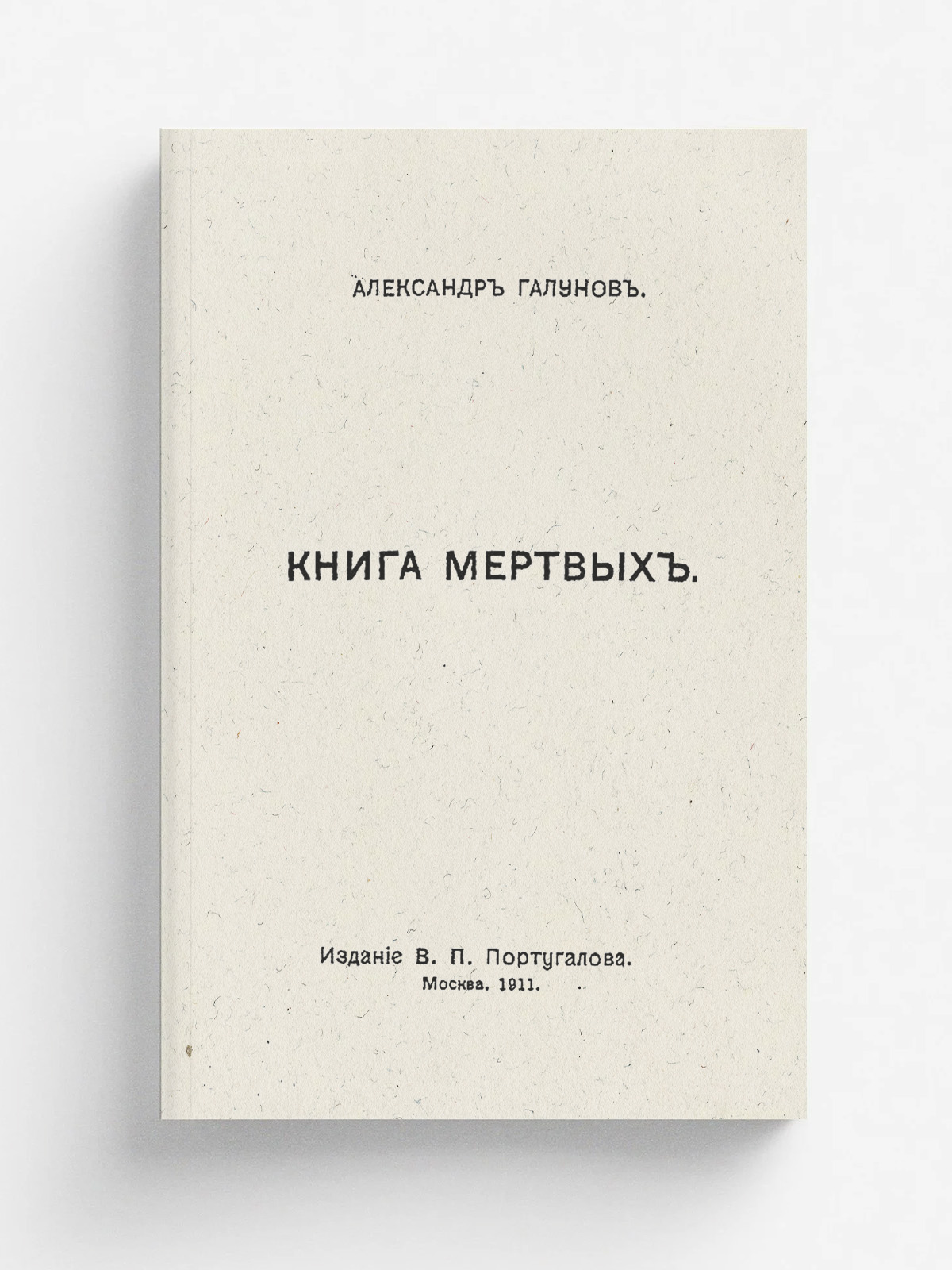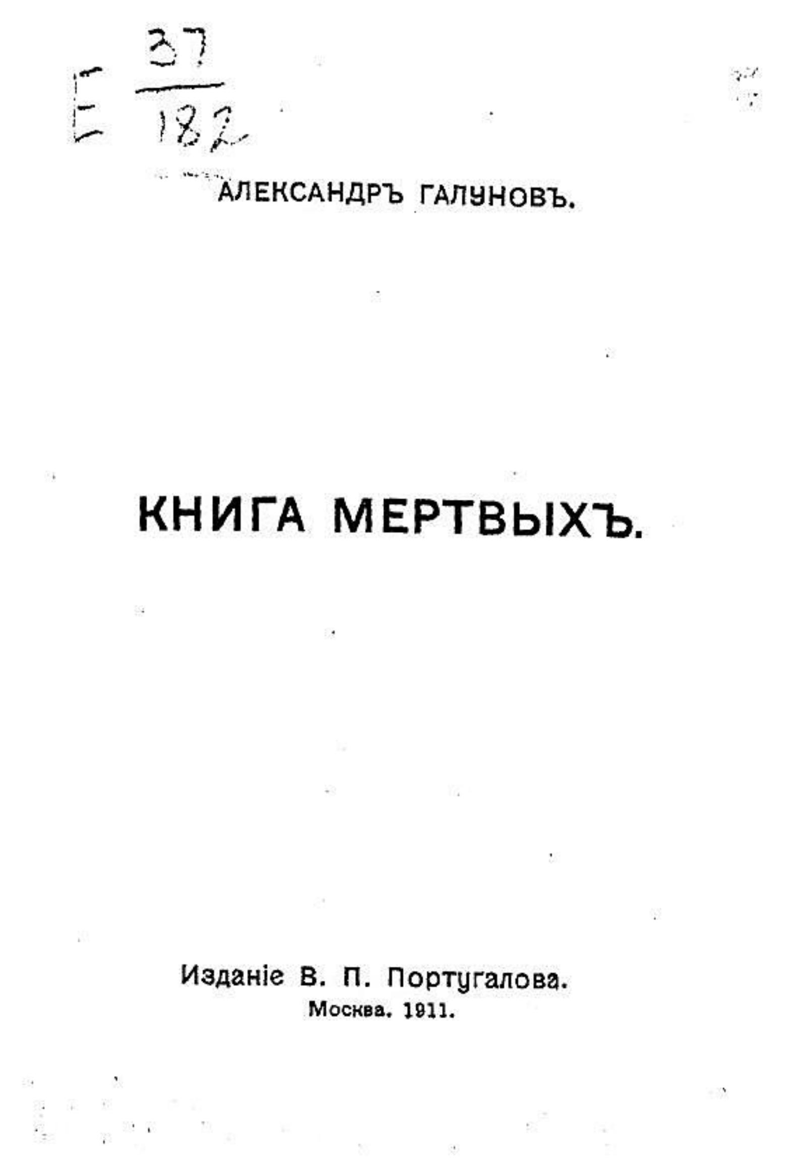 Галунов, Александр. Книга мертвых : [Рассказы] / Александр Галунов. — Москва: В. П. Португалов, 1911. — 102 с.; 16.