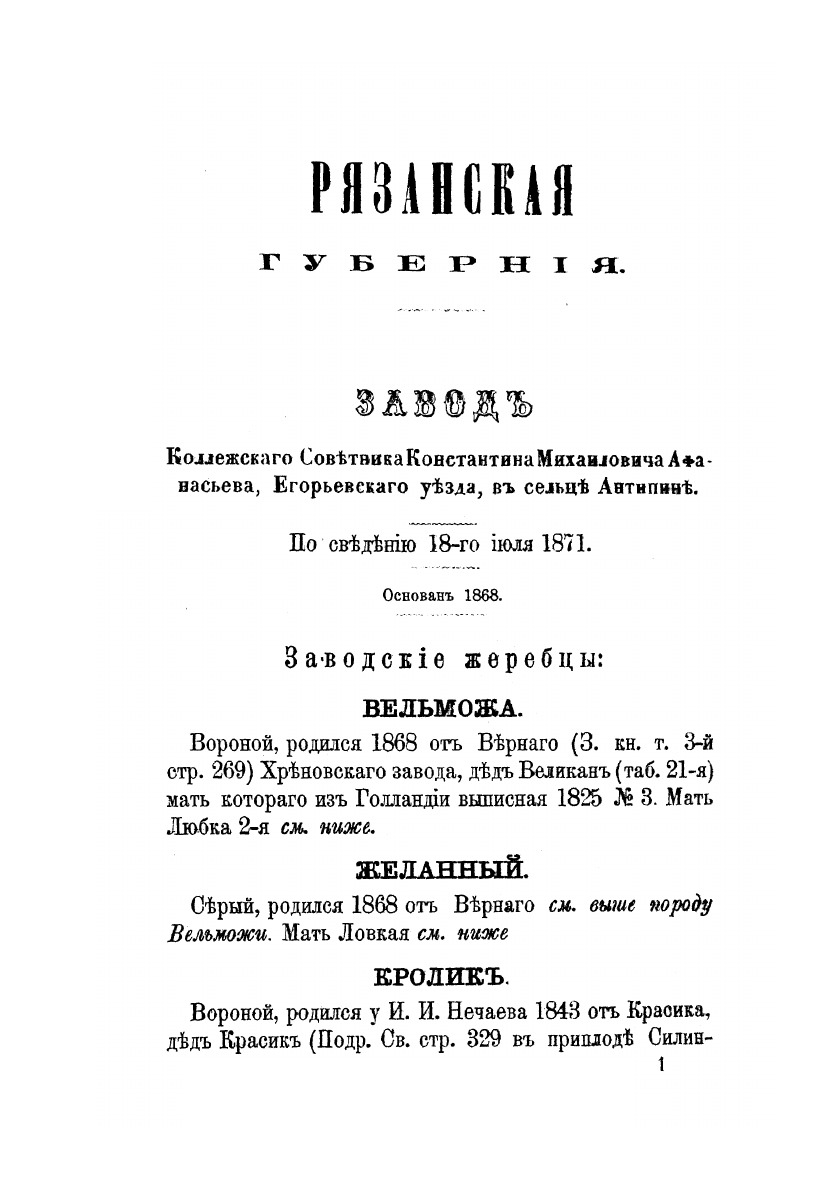 Книга рысистых лошадей в России с определением чистопородности. Губернии Рязанская, Московская, Смоленская и Калужская.