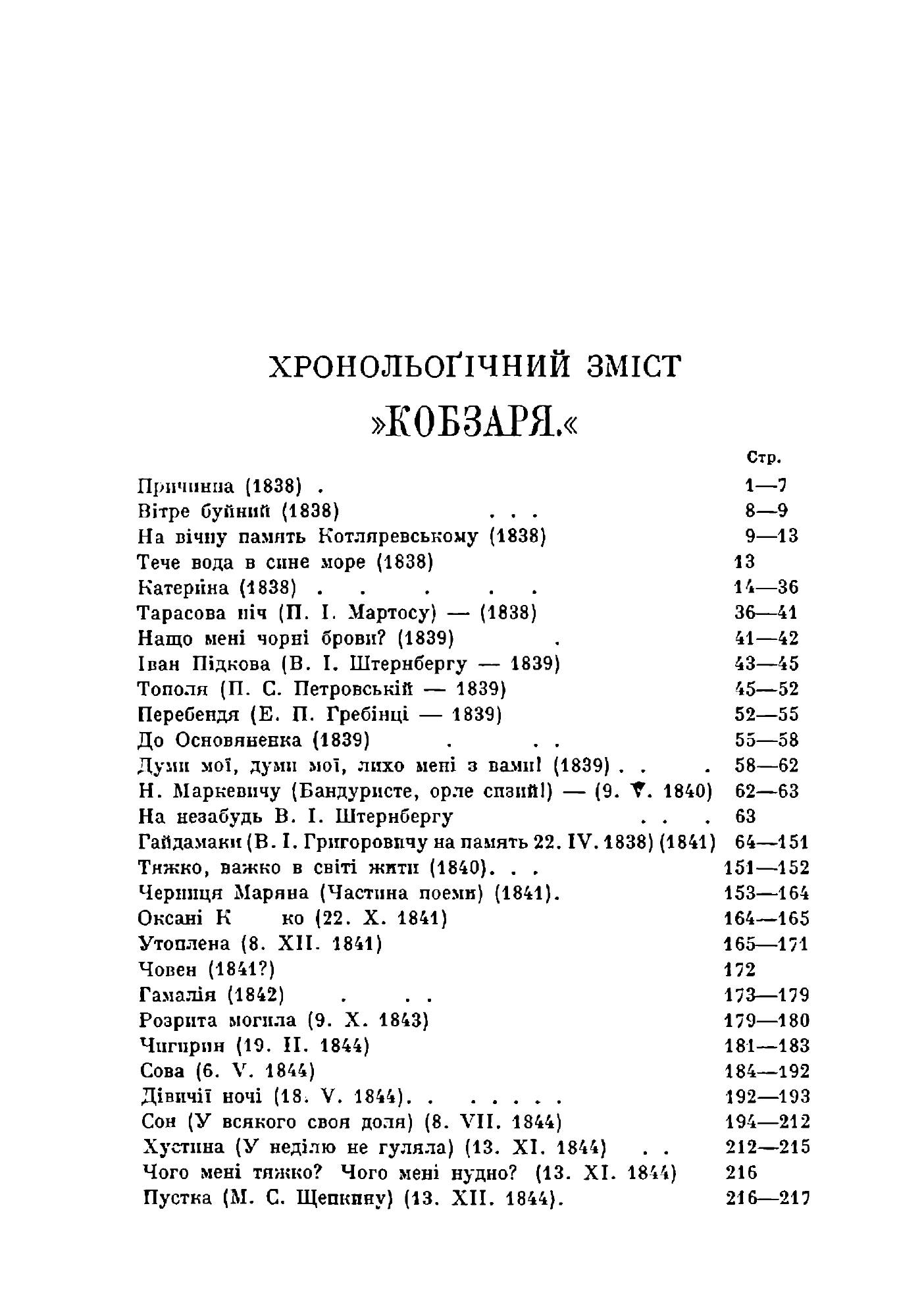 Впервые «Кобзарь» был издан в 1840 году в Петербурге при содействии Евгения Гребёнки. В сборник вошло восемь произведений: «Перебендя», «Катерина», «Тополь», «Мысль» («На что чёрные мне брови…»), «К Основьяненко», «Иван Подкова», «Тарасова ночь» и «Думы мои, думы мои, Горе мне с вами!», написанное специально для этого сборника и являющееся своего рода эпиграфом не только к этому изданию, но и ко всему творчеству Тараса Шевченко.
