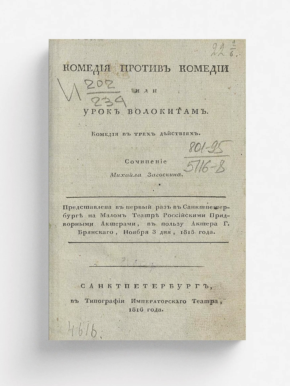 Загоскин, Михаил Николаевич (1789–1852). Комедия против комедии или Урок волокитам = Урок волокитам : комедия в трех действиях : сочинение Михайла Загоскина ; представлена в первый раз в Санктпетербурге на Малом театре российскими придворными актерами, в пользу актера г. Брянскаго, ноября 3 дня, 1815 года. — Санктпетербург : в Т. Императорскаго театра, 1816. — [2], IV, 90 с.; 8° (23 см).