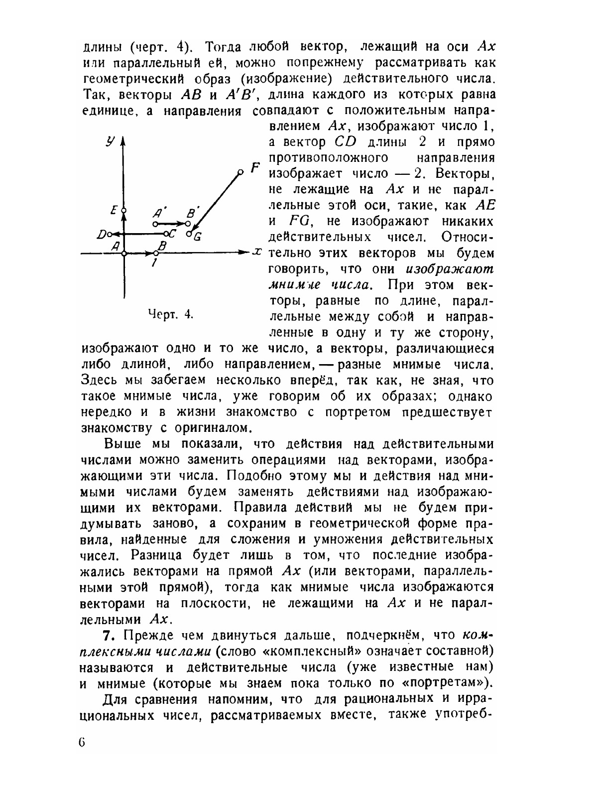 Эта книга знакомит читателя с комплексными числами и простейшими функциями от них (включая функцию Н.Е. Жуковского с применением к построению профиля крыла самолёта). Изложению придана геометрическая форма. Комплексные числа рассматриваются как направленные отрезки, а функции - как отображения. Чтобы привести читателя к такому пониманию комплексных чисел, мы начинаем с геометрического истолкования действительных чисел и действий над ними. В основу книжки положена лекция, читанная автором для школьников 9-го и 10-го классов. Предварительного знакомства с комплексными числами от читателя не требуется.