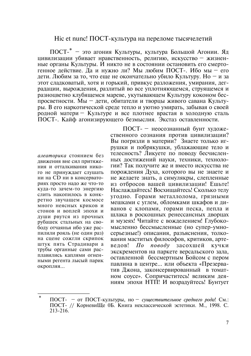 Монография представляет собой вторую публикацию по экспериментальному проекту «Неклассическая эстетика». В данном выпуске основное внимание уделено анализу наиболее дискуссионных и продвинутых направлений в современном искусстве и художественных практиках. Ряд проблем русского символизма и авангарда начала века рассматриваются под углом зрения зарождения в них элементов и блоков последующего развития художественной материи в направлении модернизма, постмодернизма, постпостмодернизма. Как и в первом выпуске видное место в книге занимают Материалы к Лексикону неклассической эстетики, включены и некоторые нетрадиционные формы вербализации современного художественного опыта. Несомненный интерес представляет публикация архивных материалов, связанных с деятельностью ленинградской художественной группы «Метафизический синтетизм», возглавлявшейся в 60-е гг. М.Шемякиным.