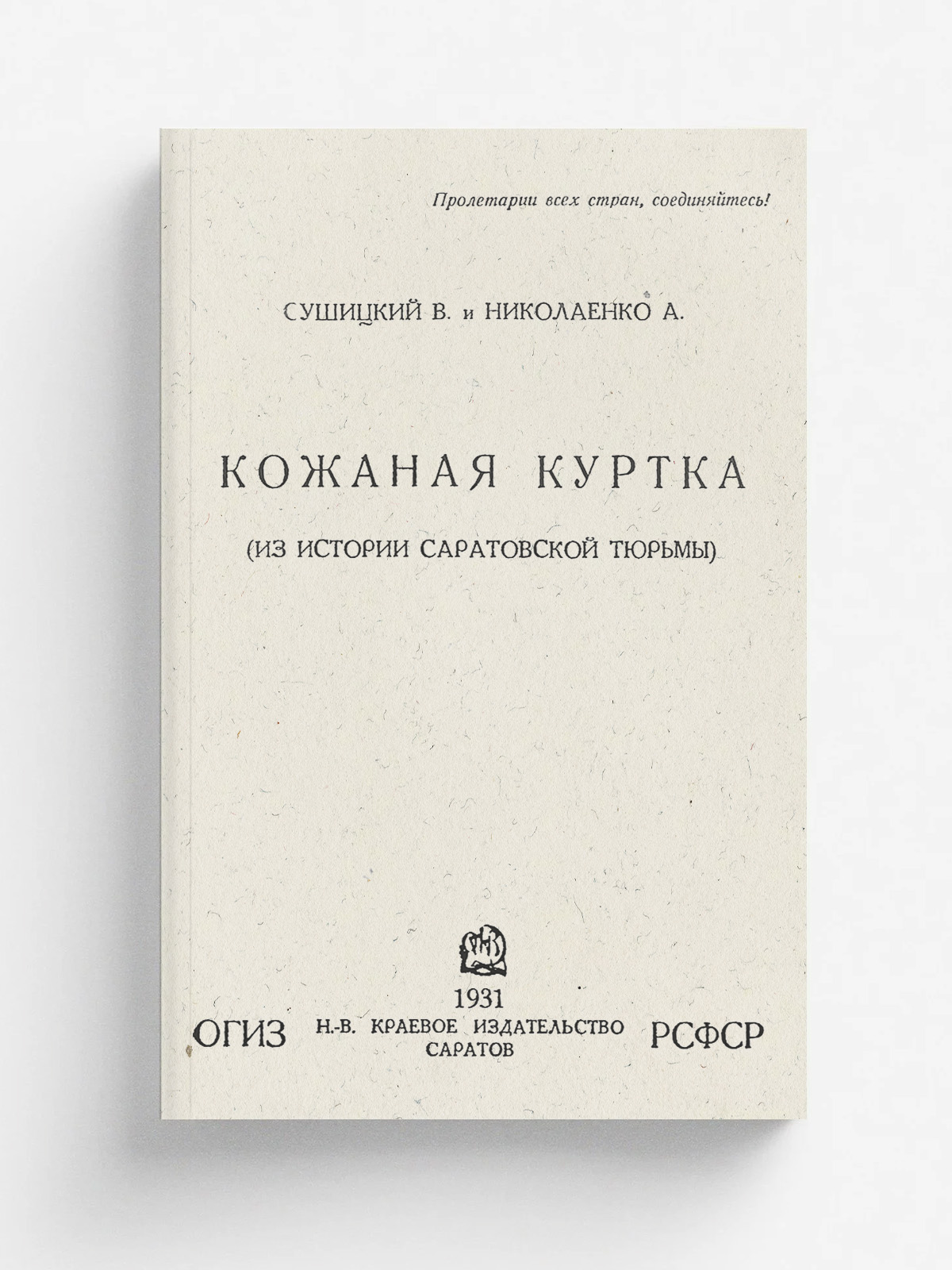 Сушицкий, Владимир Афанасьевич. Кожаная куртка (Из истории Саратовской тюрьмы) / В. Сушицкий, А. Николаенко; Н.-Волж. краев. музей. — Саратов: Огиз РСФСР — Н.-В. краев. изд-во, 1931 (тип. № 2 Н.-В. крайполиграфтреста). — 15 с. : ил.; 17×13 см.