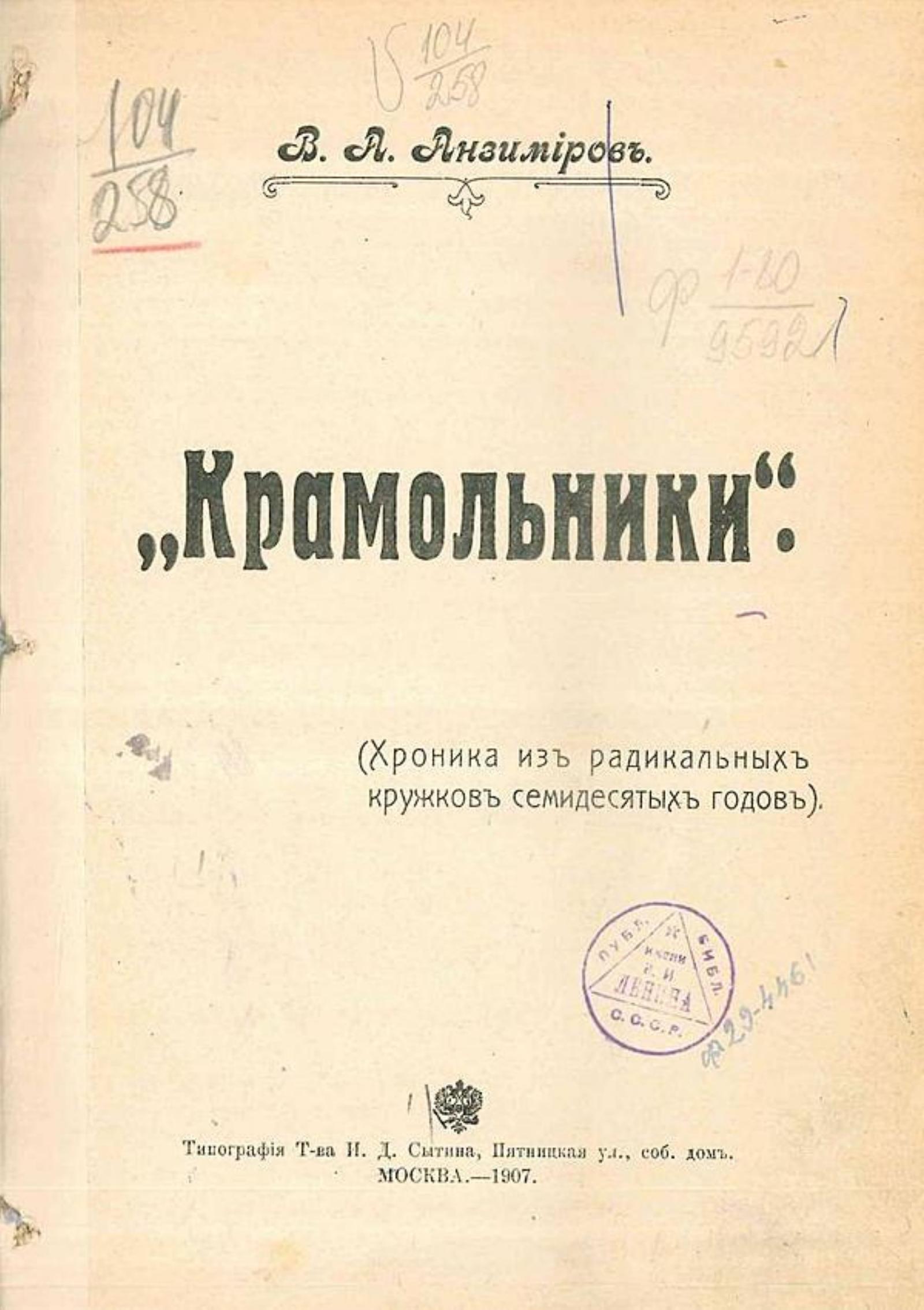 Анзимиров, Владимир Александрович (1859-ок. 1920). «Крамольники»: (Хроника из радик. кружков семидесятых годов) / В. А. Анзимиров. — Москва: тип. т-ва И. Д. Сытина, 1907. — 175 с. : ил., портр.; 20.